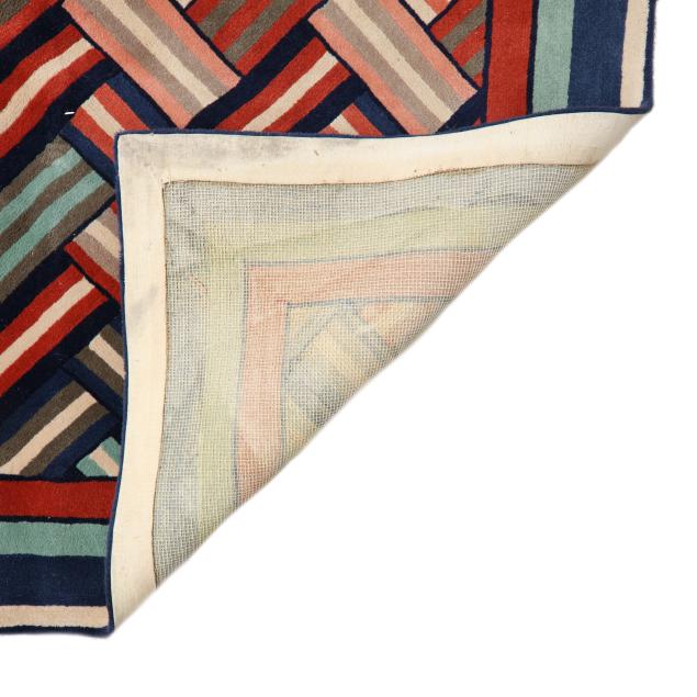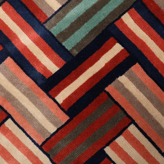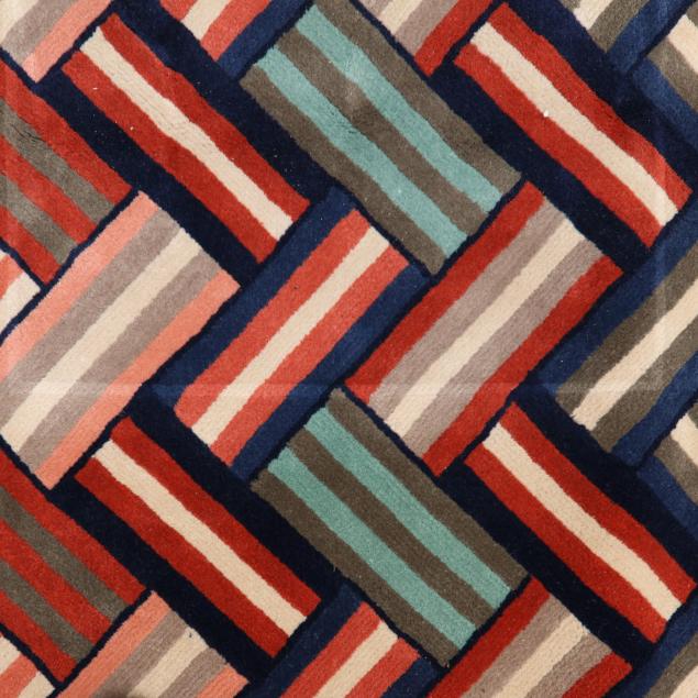 Machine made, wool, with allover chevron brickwork pattern in salmon, tan, gray, blue, and aqua colors, with wide striped border.