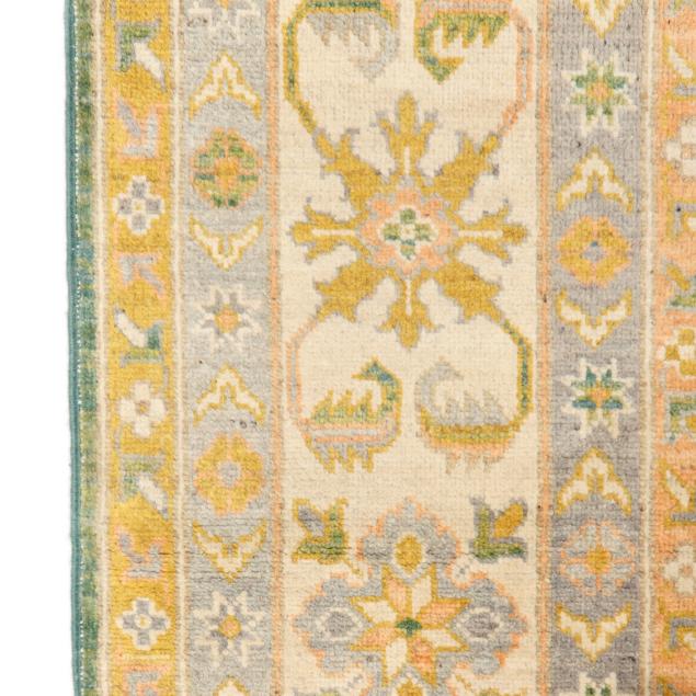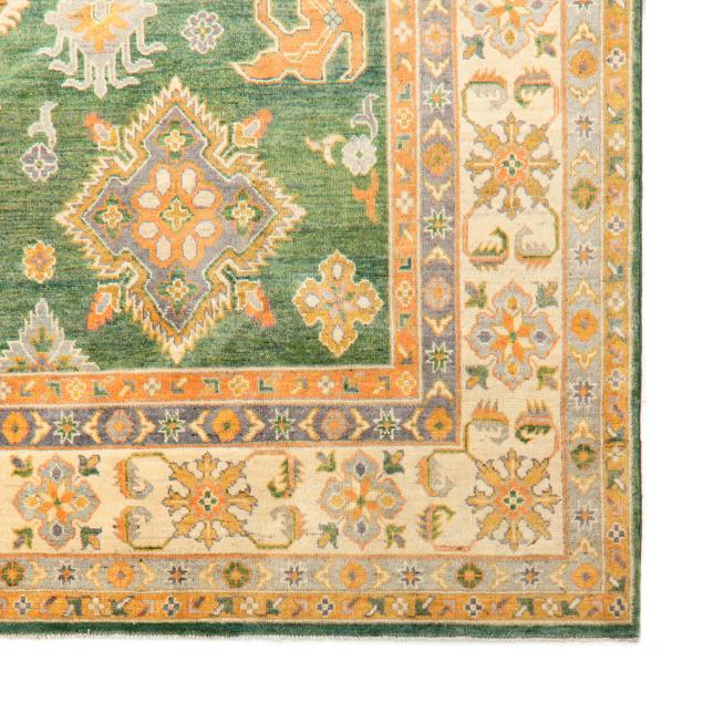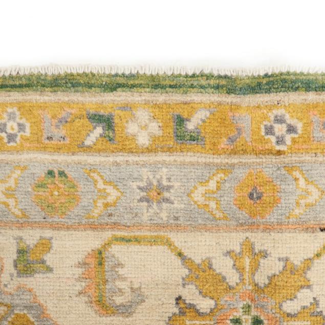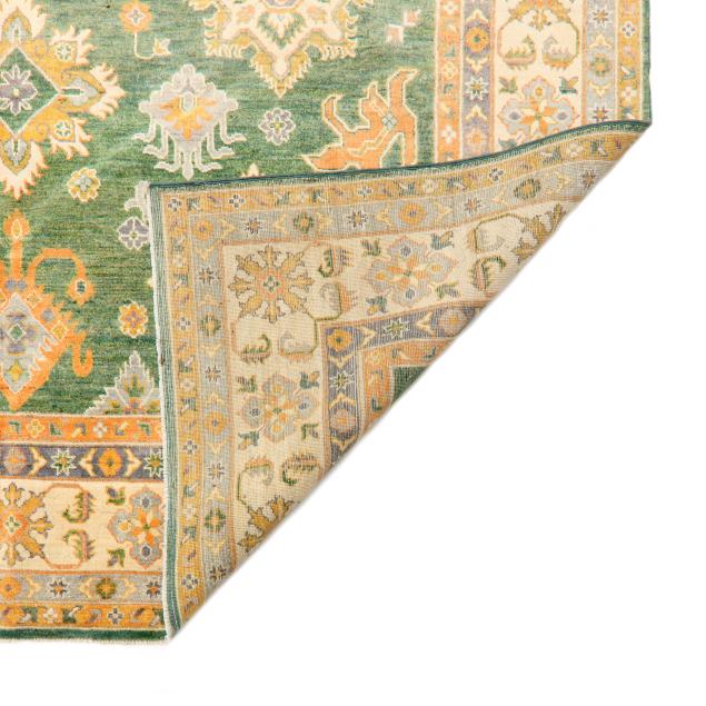 Wool on cotton foundation, the green field with detached geometric and floral motifs in light orange and grays, the main cream border with repeating floral motifs, within minor borders.