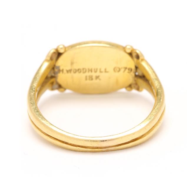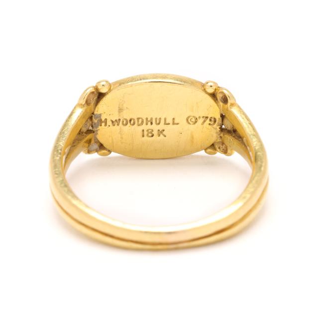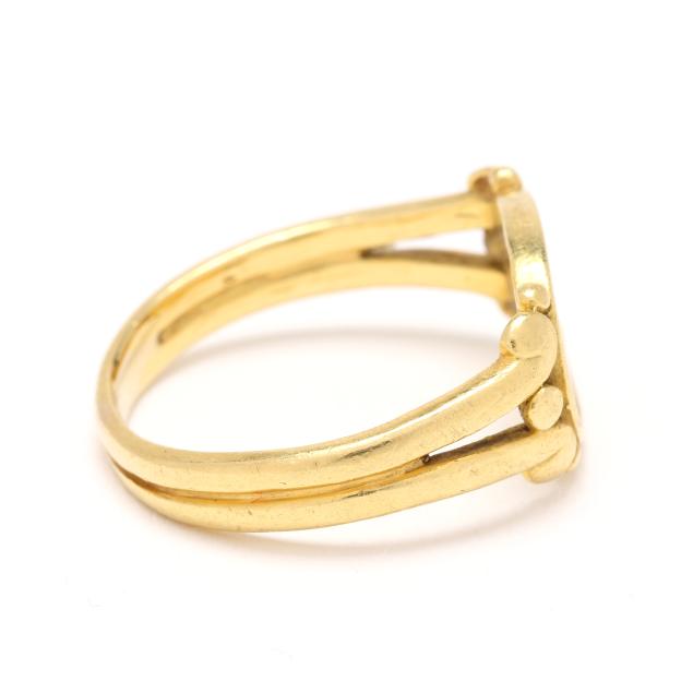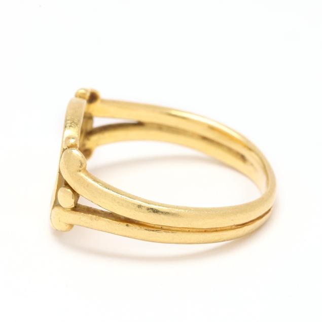 1979, the oval Greco-Roman style ring with plaque resembling an ancient coin with avian motif in oval surround and scrolled shoulders, completed with a split shank, dated, signed, and stamped 18K.