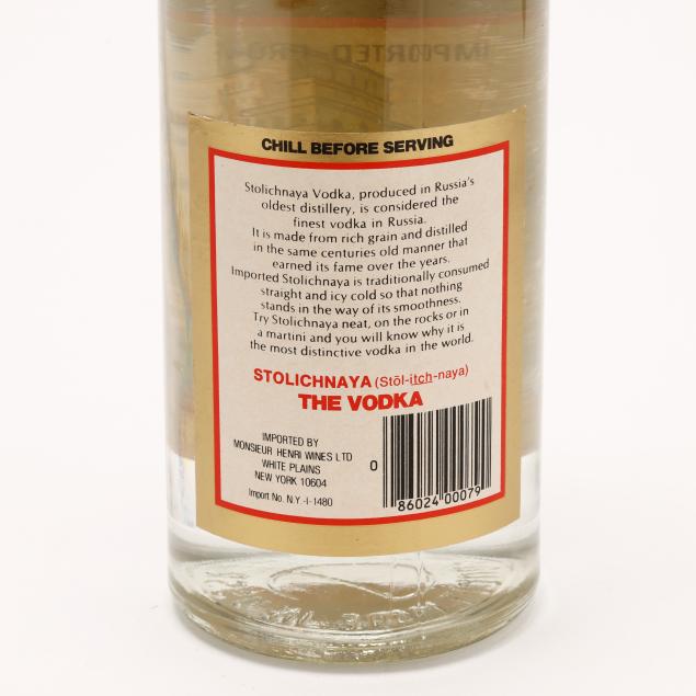NV, Stolichnaya Vodka, Imported from the USSR, 40%, thought to be 1980s bottling, into neck, sealed (1 1 L)