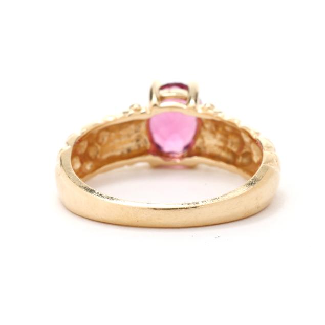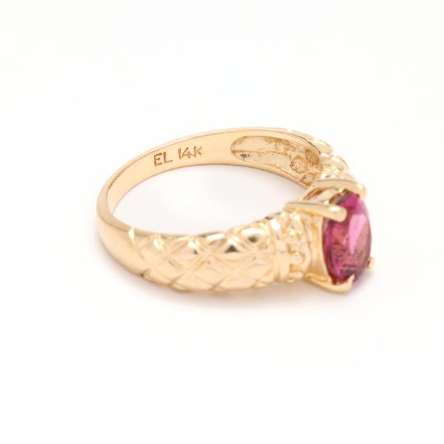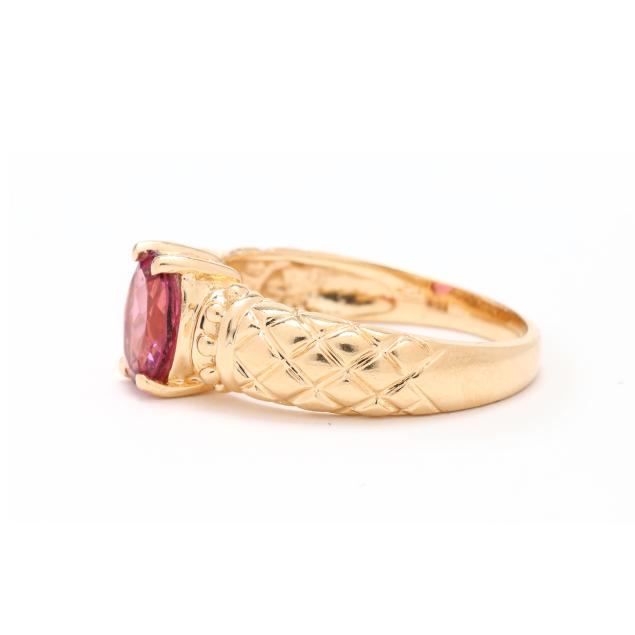 Centered on an oval cut pink topaz (7.85 x 6.02 x 3.55mm) weighing approximately 1.25 carats, with matelassé design to shoulders, stamped EL 14K.