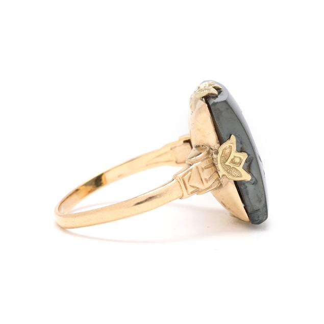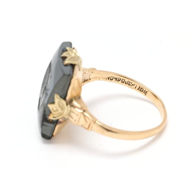 Centered on a rectangular hematite intaglio (16 x 12mm) carved with the profile of a Greco-Roman soldier, with acanthus motif to shoulders, stamped with a maker's mark and 10K.