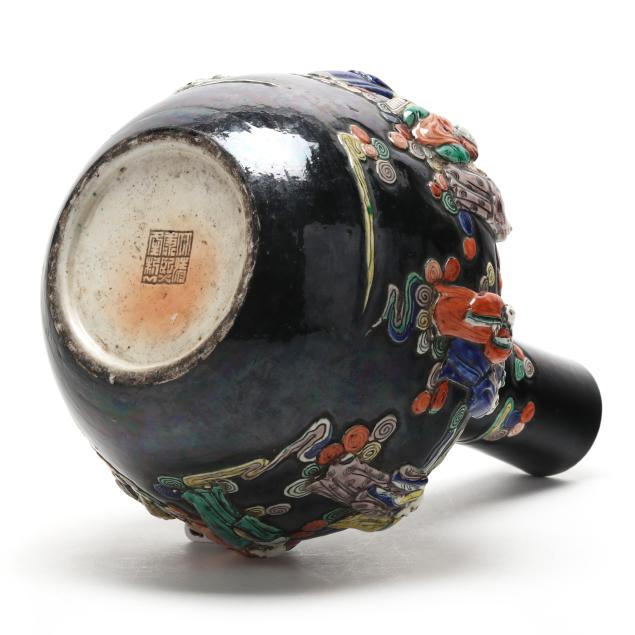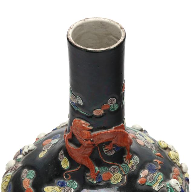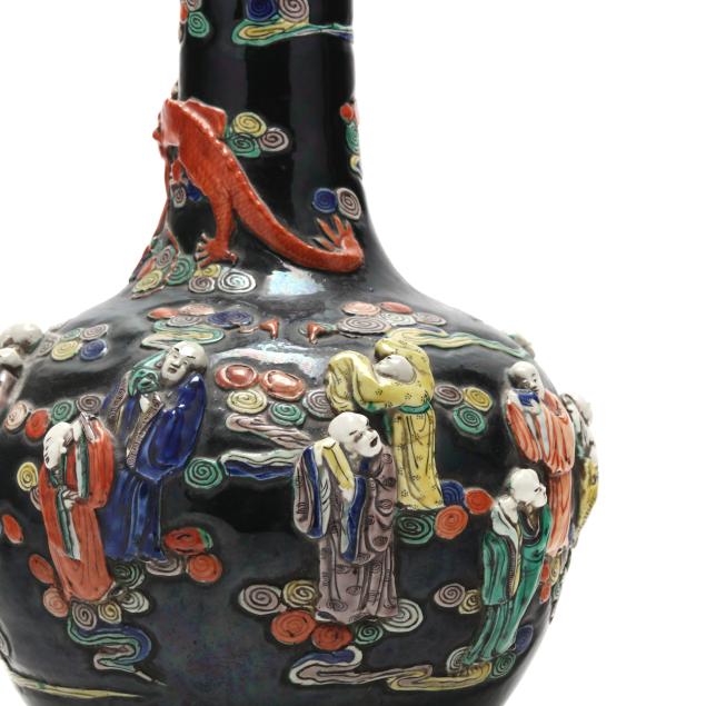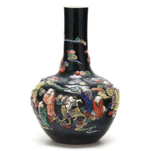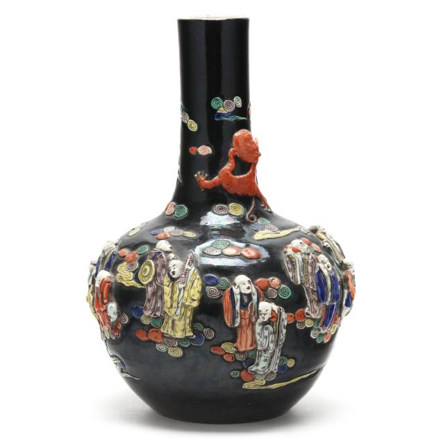 Guangxu Period (1875–1908), an ovoid form vase with tall cylindrical neck, richly enameled against a lustrous black ground and applied in high relief with figures of the Eight Immortals (
