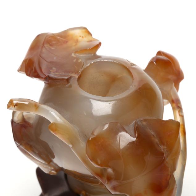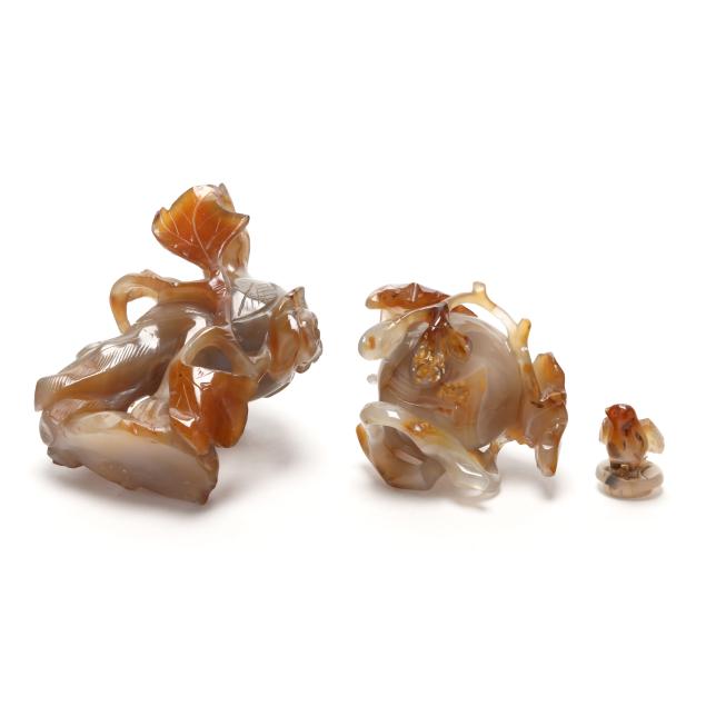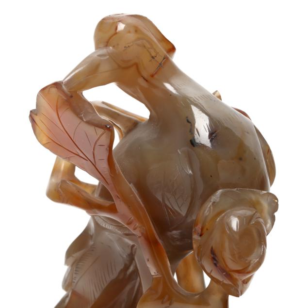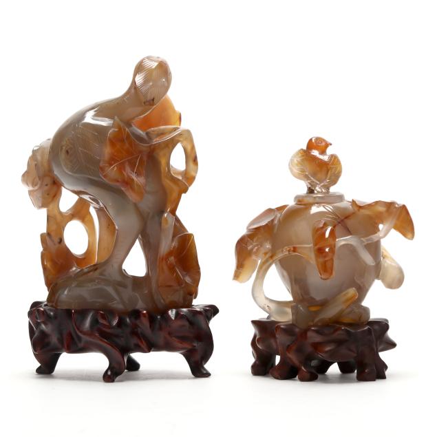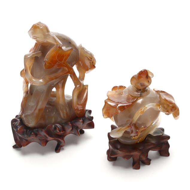 Qing dynasty (1644-1912), 19th century, includes a carving of a crane or heron wrapped in lotus leaves and a small bottle also wrapped in tendrils surmounted with a cover of a baby bird, the agate is a translucent pale amber brown color with characteristic amber and milky white markings, both carvings are presented together with fitted carved wood stands.