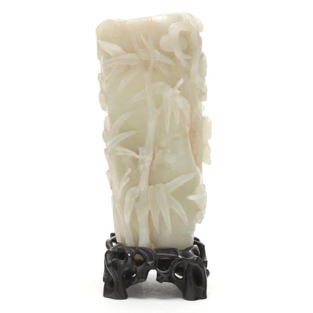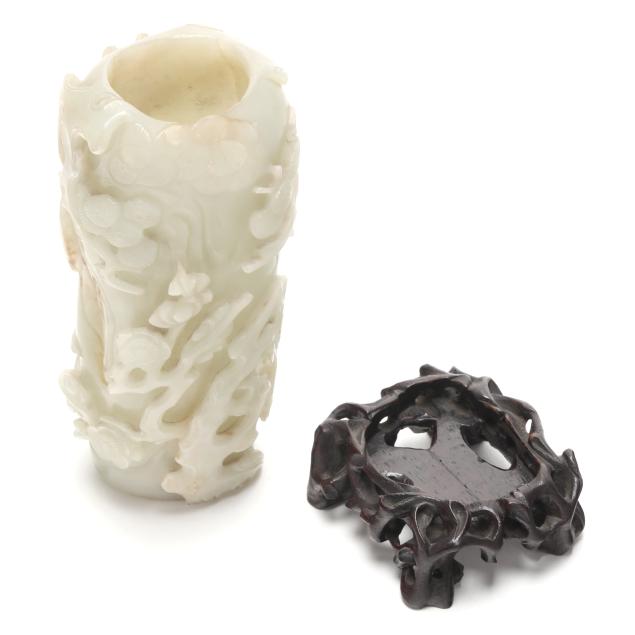Qing dynasty (1644-1912), 18th or 19th century, pale celadon white jade cylindrical form vase carved with the "Three Friends of Winter" pine, plum, and bamboo, presented together with a fitted carved wood stand.