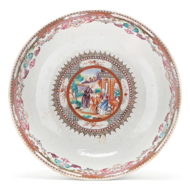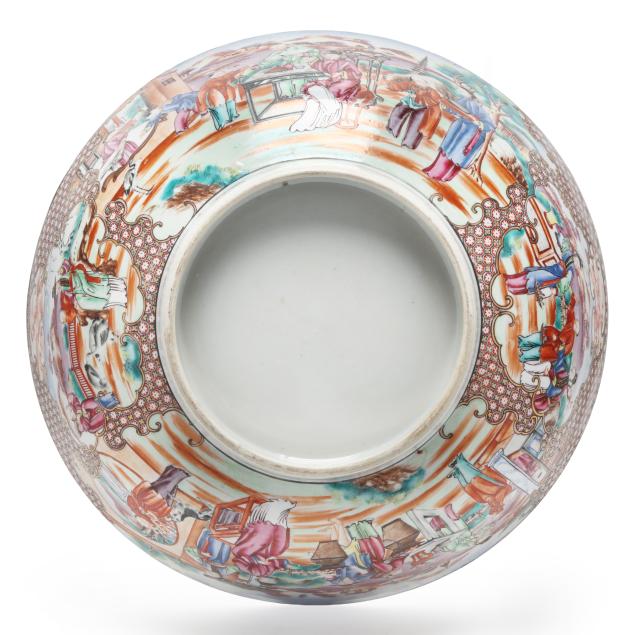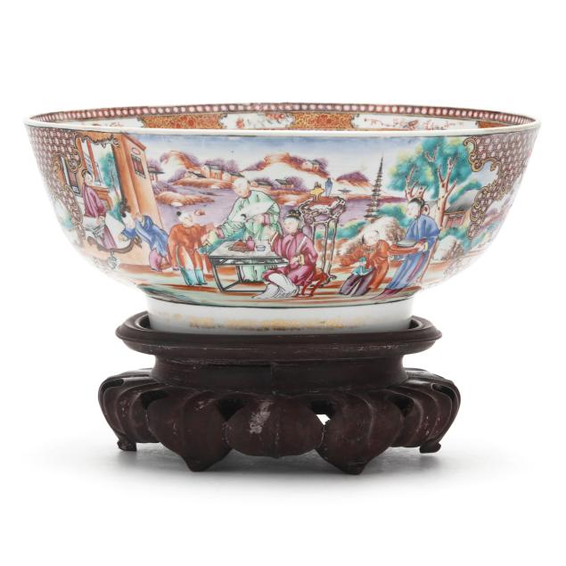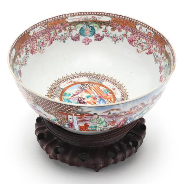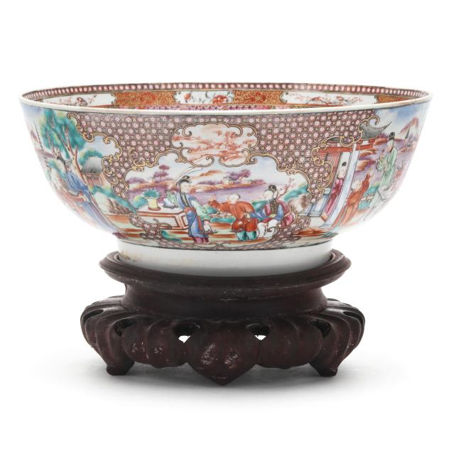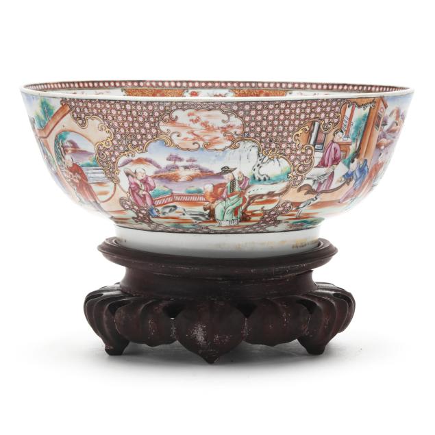 Qing dynasty (1644-1912), 18th century, porcelain bowl elaborately hand-painted with Mandarin figures in scenic landscapes within diaper pattern borders, the interior with shaped floral bands of decoration along the rim, the central well with a medallion containing a figural scene, raised on a short straight foot, presented together with a carved wood stand.