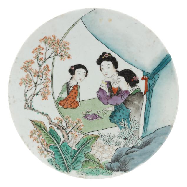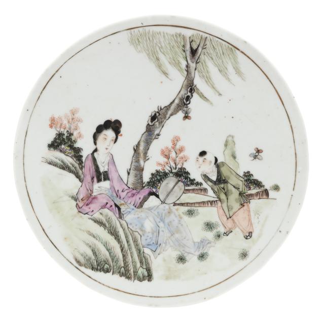 Republic period (1912-1949), each circular porcelain plaque is finely painted in soft famille rose enamels, the first with an elegant lady seated beneath a willow attended by a young boy holding a round fan, the garden enlivened by flowering shrubs and butterflies, and the second with three court ladies in a pavilion playing a game, framed by blossoming branches and rockwork, the figures display refined almond-shaped faces and ornate coiffures, their robes delicately shaded in rose, turquoise, and celadon.