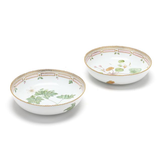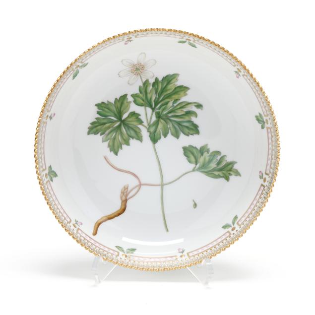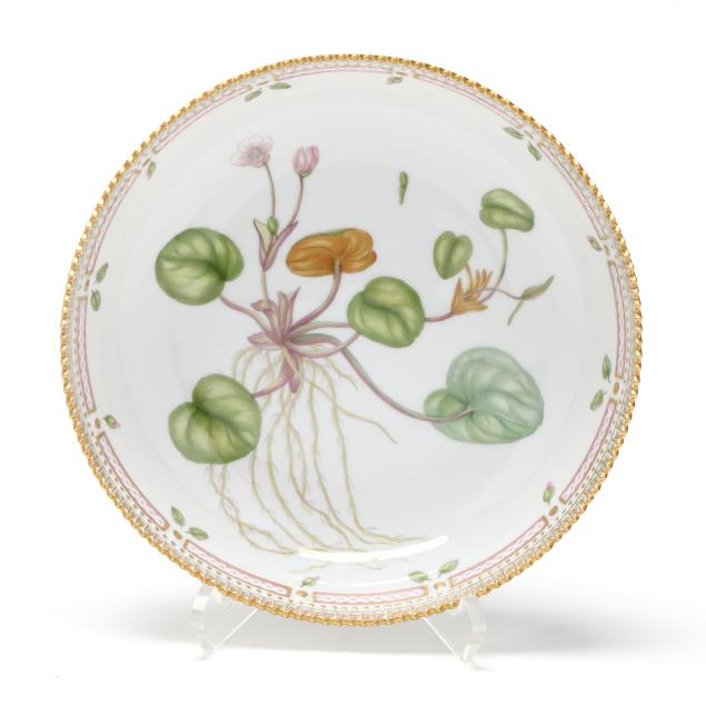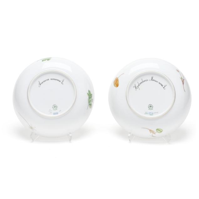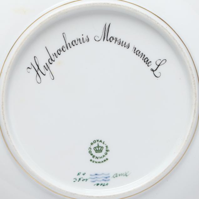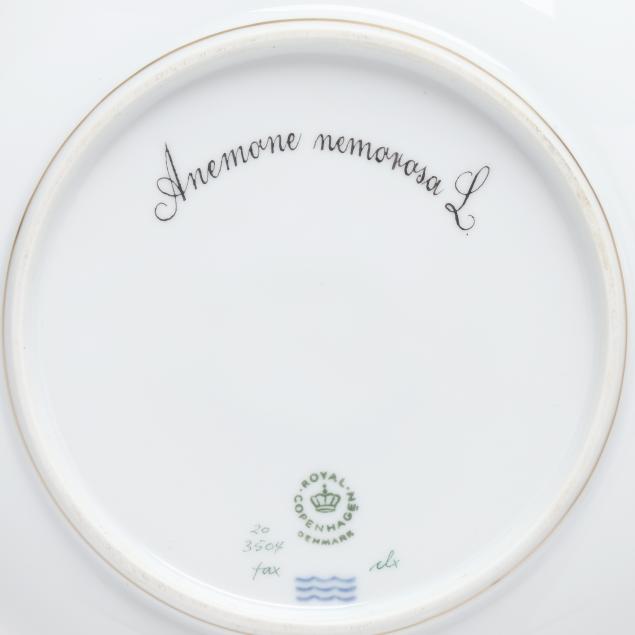 Denmark, 1974-1978 date marks, hand-painted and gilt porcelain, pattern no. 20, shape no. 3504, marked with green printed and blue wave factory marks and Latin botanical specimen name to the underside, the first decorated in
