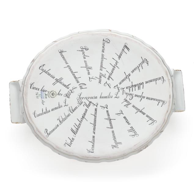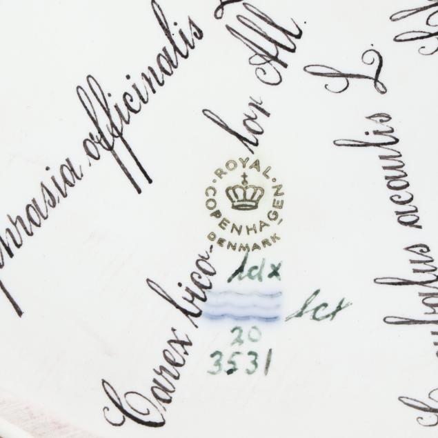 Denmark, 1969-1973 date mark, hand-painted and gilt porcelain, pattern no. 20, shape no. 3531, marked with green printed and blue wave factory marks, Latin botanical specimen names to the underside, including Scorzonera humilis to the interior center, with the following arranged radially along the exterior: Cucubalus acaulis L., Parnassia Kotzebuei Cham. & Schl., Viola Muhlenbergiana Hook, Cerastium semidecandrum L., Hypericum humifusum L., Scilla verna L., Sedum anglicum Huds., Antennaria alpina Gartn., Cardamine bellidifolia L., Epilobium alpinum L., Medicago polymorpha L., Drosera intermedia Hayne., Pyrola uniflora L., Anemone groenlandica Oed, Euphrasia officinalis L., and Carex bicolor All.