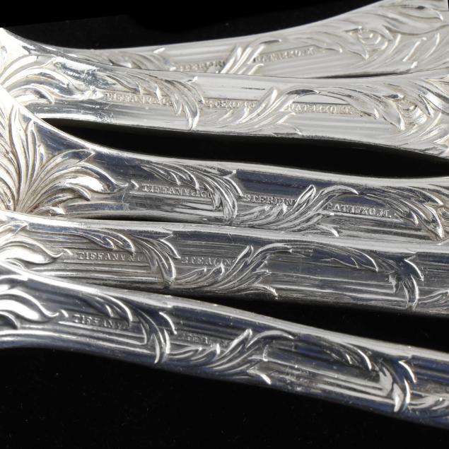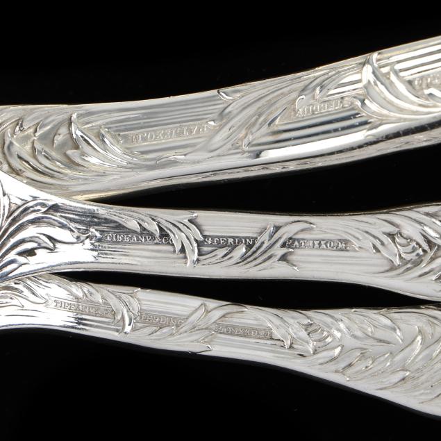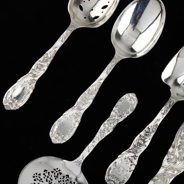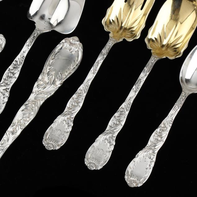 Most with period marks circa 1873-1891, directorship of Edward Moore; includes a punch ladle; salad serving set with gold wash; a tablespoon; a serving spoon; a slotted serving spoon; a tomato server; and a pastry server; a few pieces monogrammed.