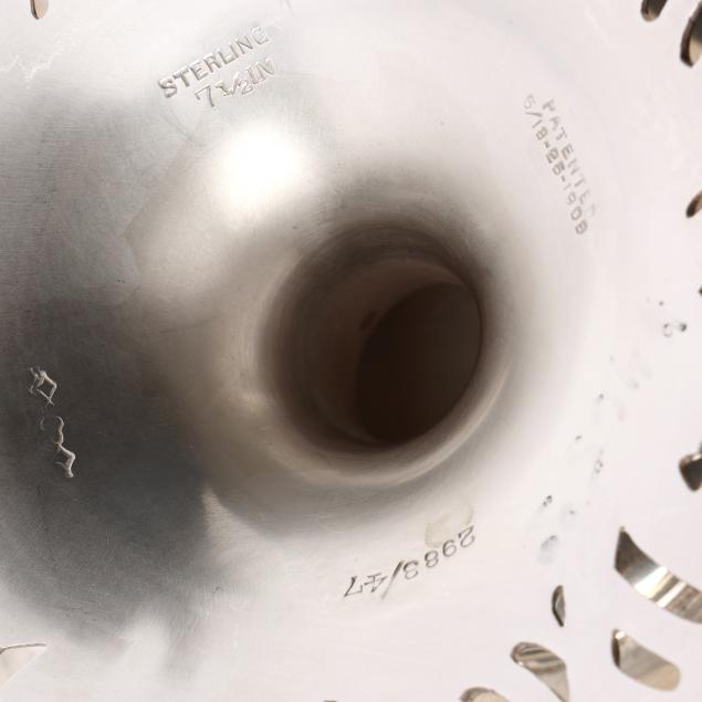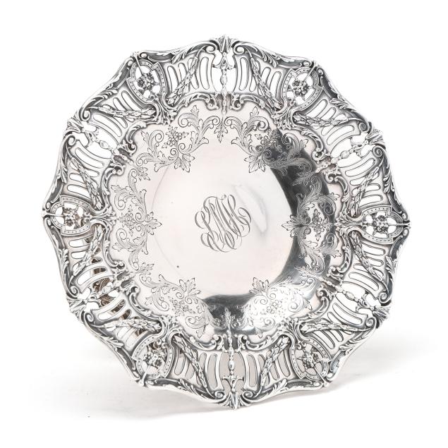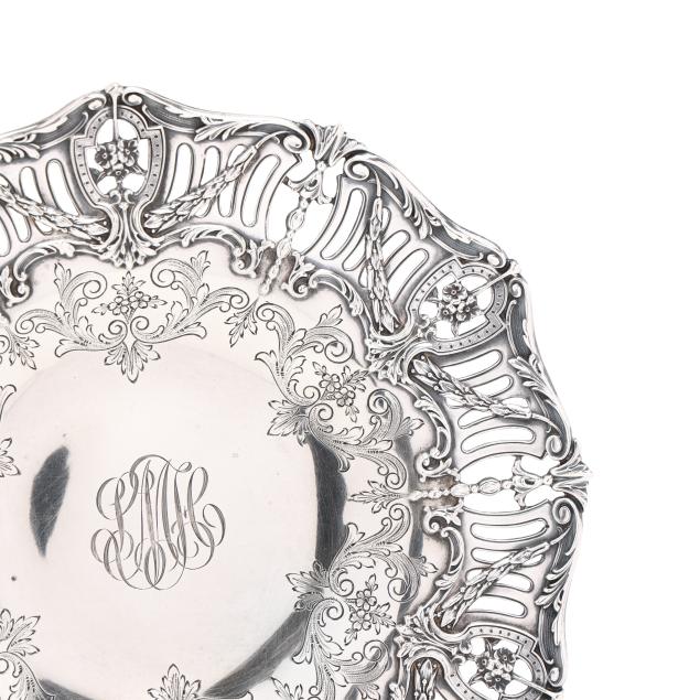 New York, circa 1910, pattern number 2983/37, featuring an openwork rim and foot with foliate and cartouche designs, script monogram to the center well, and gold wash.