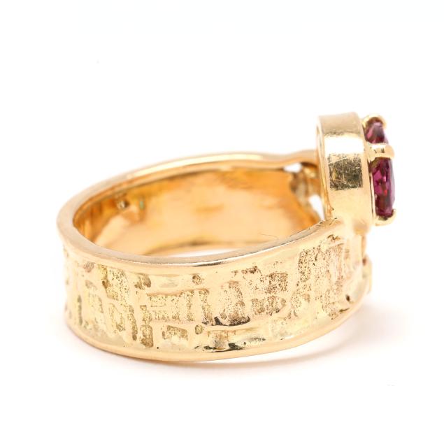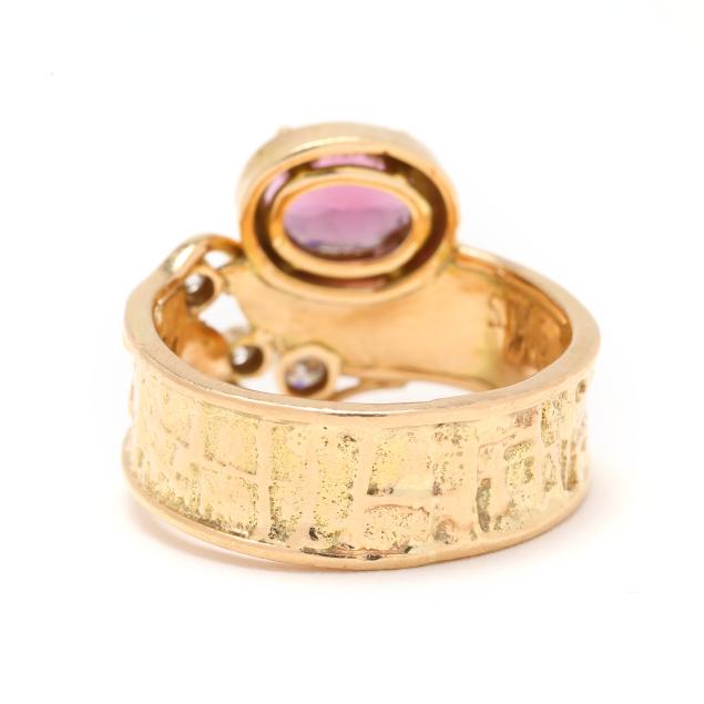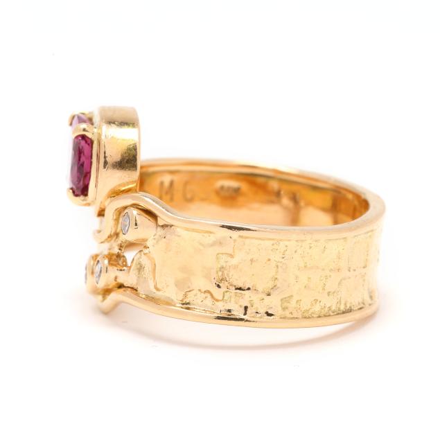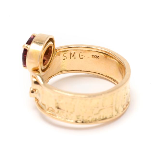 The gold band set off center with an oval cut rhodolite garnet (8.0 x 6.0 x 3.7mm) weighing approximately 1.25 carats, and with bezel set full cut round diamond melee, completed with a textured band stamped SMG 14K.