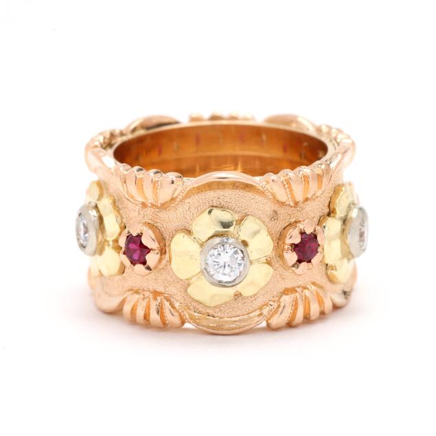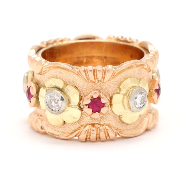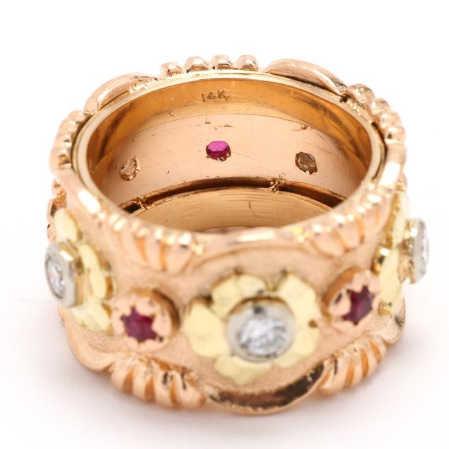 The rose gold band with applied yellow gold flowers with full cut round diamonds in white gold bezel settings, weighing approximately .40 total carat (H-I color, I1 clarity) with prong set round cut rubies, with gadrooned edge, stamped 14K.
