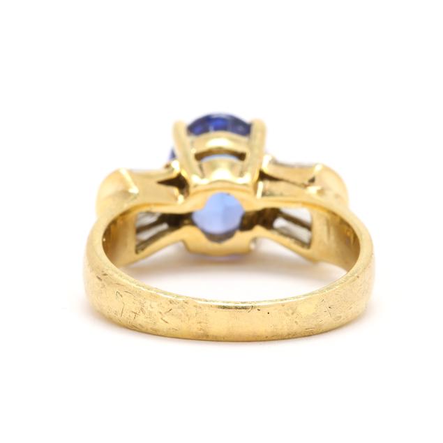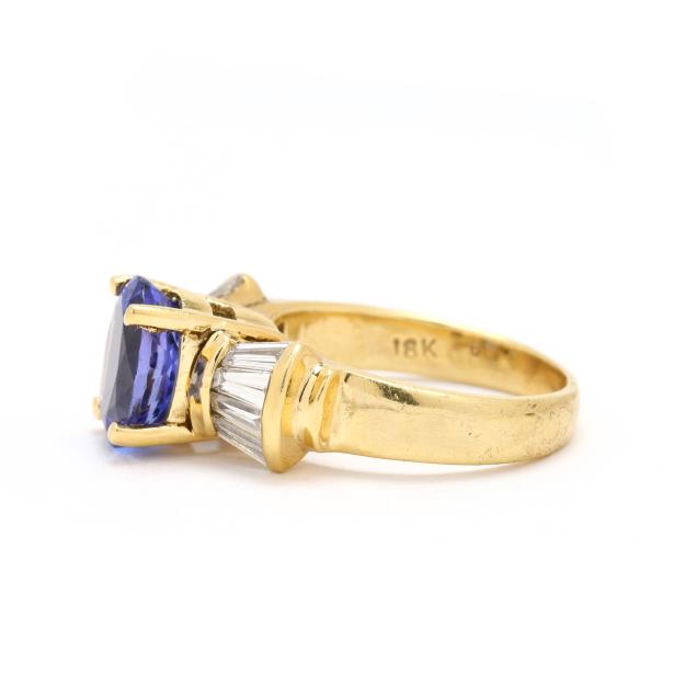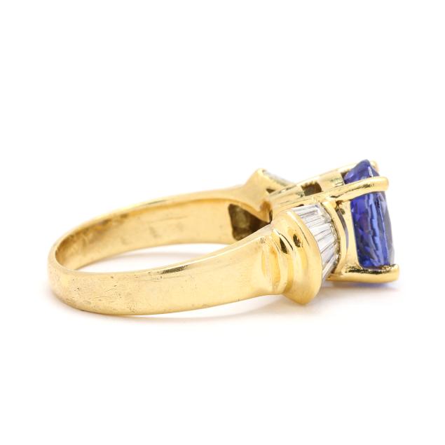 Centered on an oval cut tanzanite (8.98 x 7.07 x 4.71mm) weighing approximately 2.00 carats, set to the shoulders with baguette cut diamonds weighing approximately .75 total carat (I-J color, SI1-SI2 clarity), stamped 18K 6.