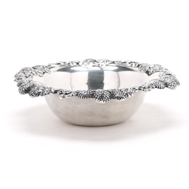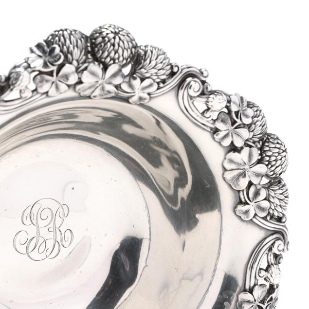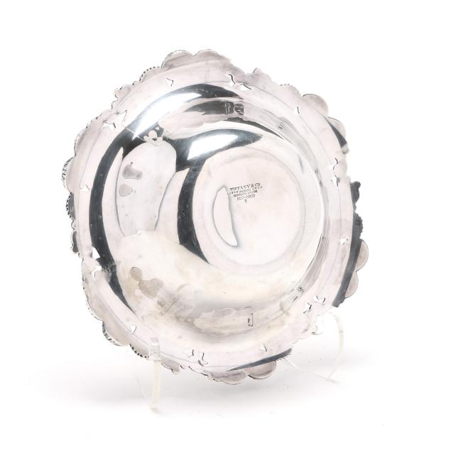Period mark circa 1892-1902, directorship of Charles L. Tiffany, pattern number 18780, featuring an openwork rim with clover flower and leaf decoration, monogrammed to the center.