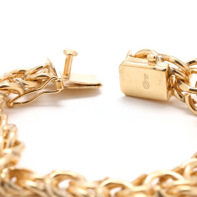 The double curb link bracelet completed with an integrated box clasp and figure eight safety, stamped 14KT and with a maker's mark.