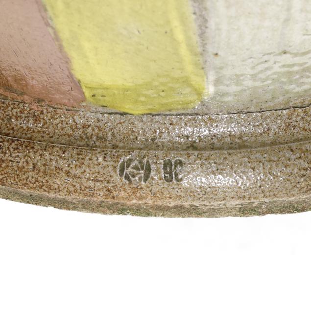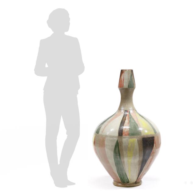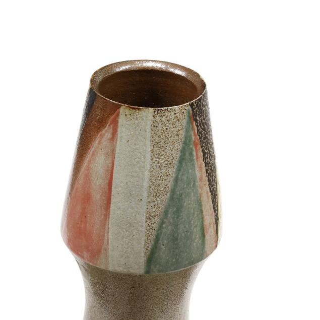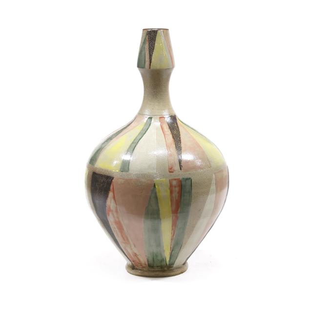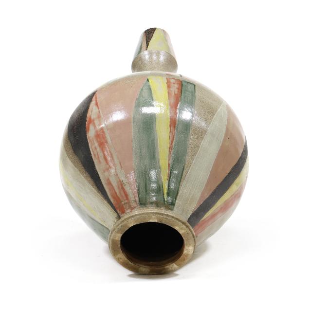 Pittsboro, North Carolina, salt glazed stoneware, signed with circa 1995-present "WMH" oval cipher and "II" to the foot rim, highly ovoid body with round hollow foot, supporting a flared neck with tapering capital, decorated in radial manganese, rose, yellow, and copper green glazes.