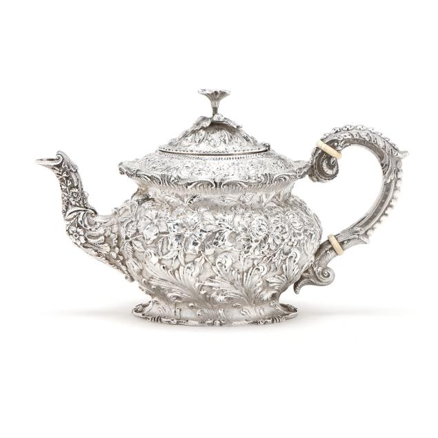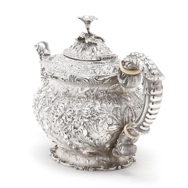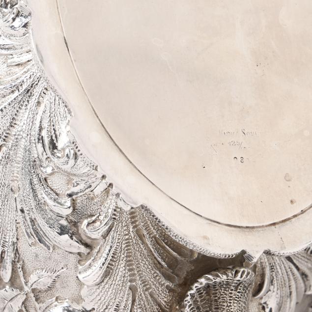 Circa 1896-1924, featuring shell form and bead course decoration to the handle, a floral finial, and pedestal foot, not monogrammed.