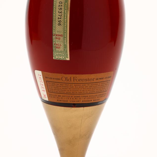 NV, Old Forester Kentucky Straight Bourbon Whisky, Bottled in Bond, Brown-Forman Distillers Corporation, Louisville, KY, 50%, made spring 1952, bottled fall 1957, 2cm, sealed Sputnik decanter (1 4/5 Quart)