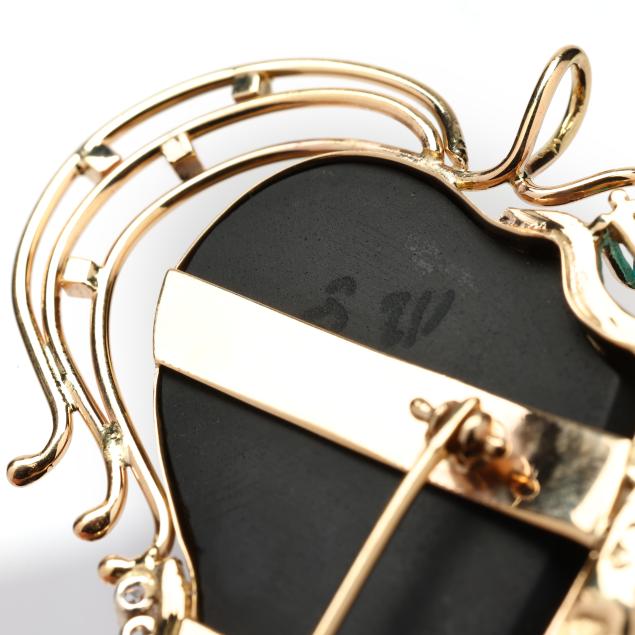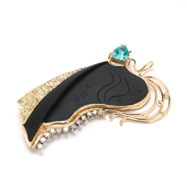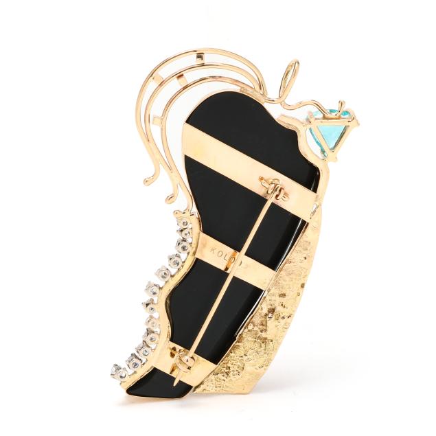 The shaped brooch centered on a shaped and engraved black stone (likely black onyx) with a triangle cut blue topaz accent and set with full cut round diamonds weighing approximately .41 total carat (H-I color, SI1-SI2 clarity), completed with a single locking pin stem and bail, signed KOLOD, testing 14KT.