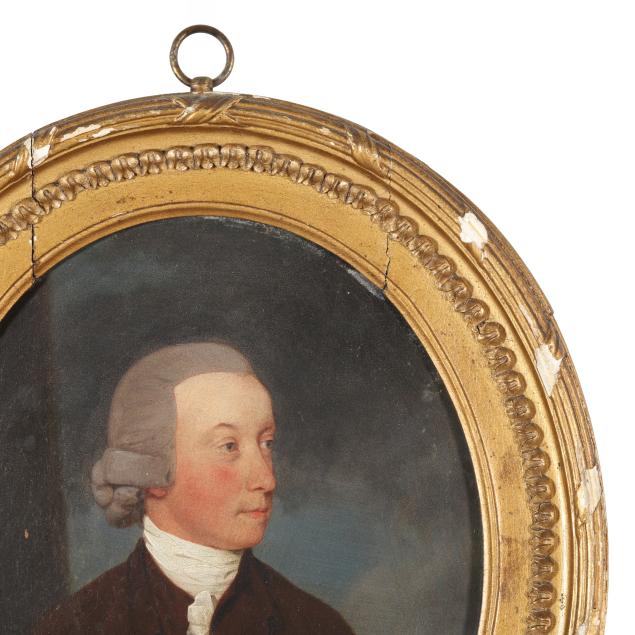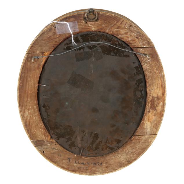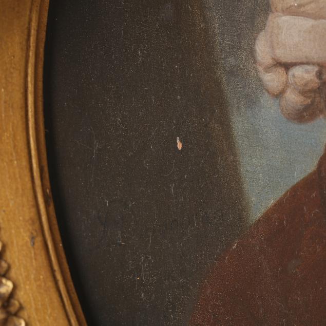 Oil on copper, 177(?), signed and dated above sitter's proper right shoulder, presented in an oval frame.