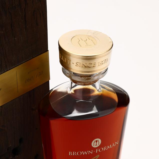 NV, Brown-Forman (Old Forester) 150th Anniversary Kentucky Straight Bourbon Whisky, 12.5 Years Old, Louisville, KY, 50%, 2020 limited bottling, bottle no. 60/150, hs, signed by George Garvin Brown, sealed glass decanter, includes presentation case made from reclaimed wood recovered from the Old Forester Whisky Row distillery fire in 2015 (1 750 ml)