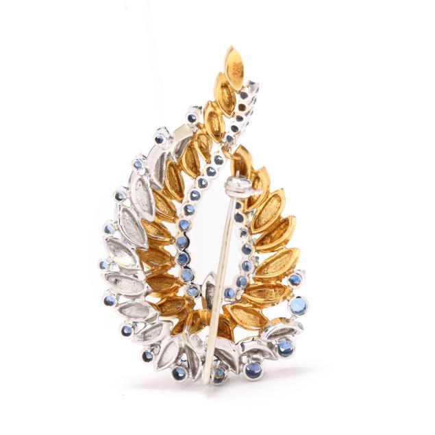With textured gold and white gold feathers, set with round cut sapphires weighing approximately 1.5 total carats, completed with a single locking pin stem, stamped 18K.