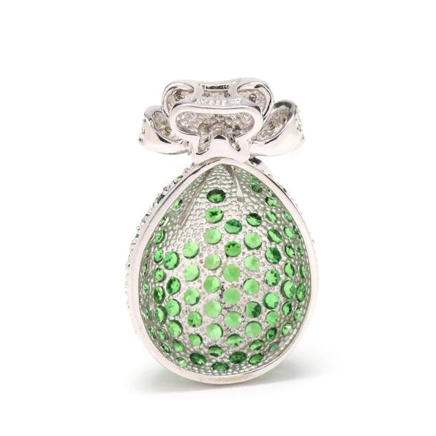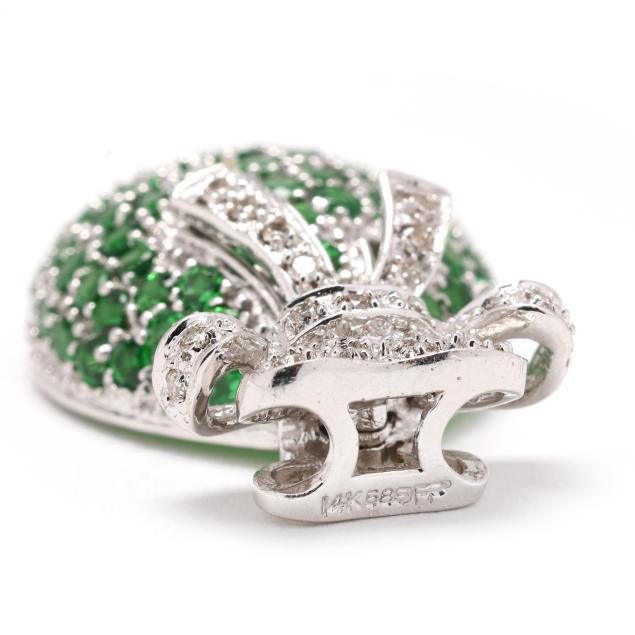 The white gold pendant in the design of a drawstring bag, pavé set with round cut green garnets throughout, completed with a bail in the form of a bow, pavé set with full cut round diamond melee, stamped 14K 585 FP.