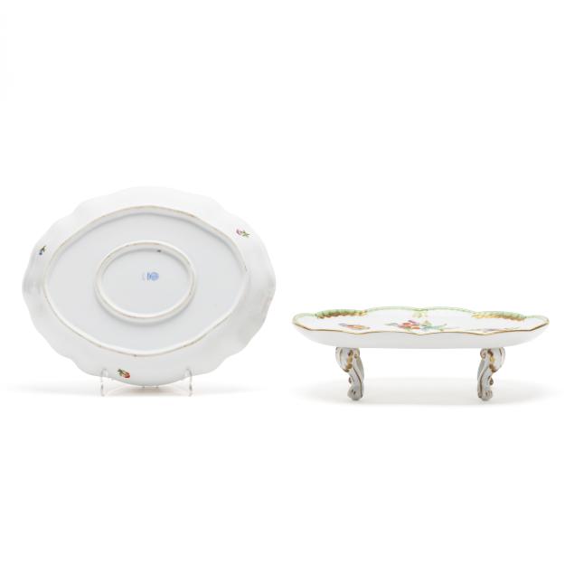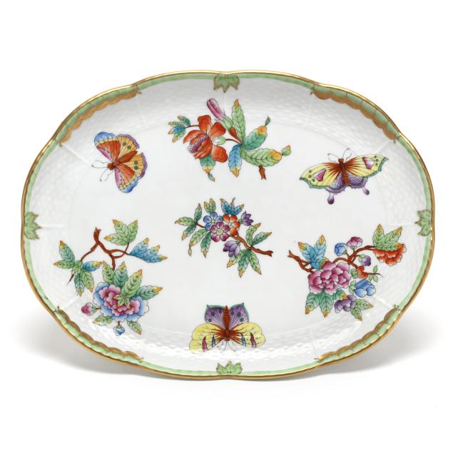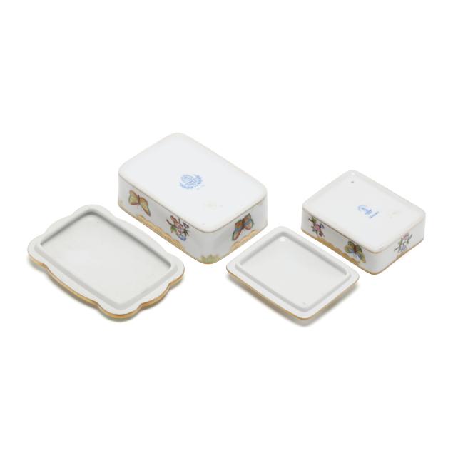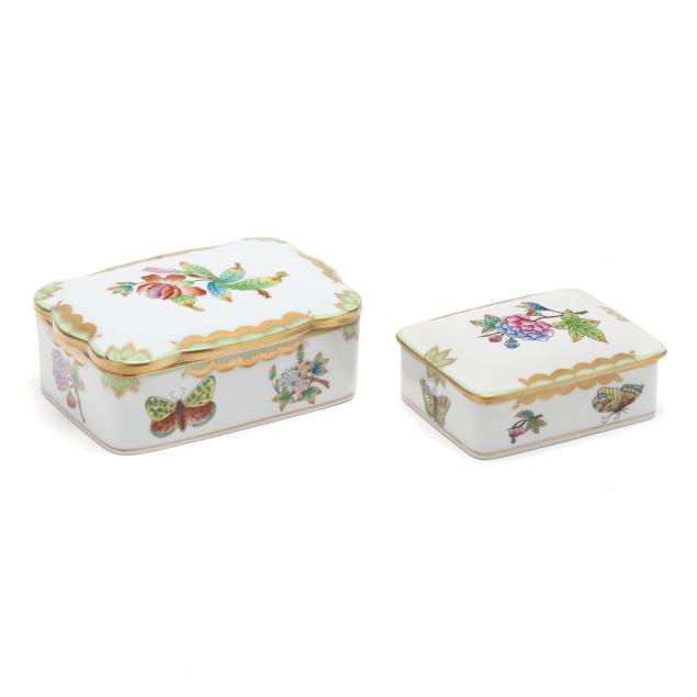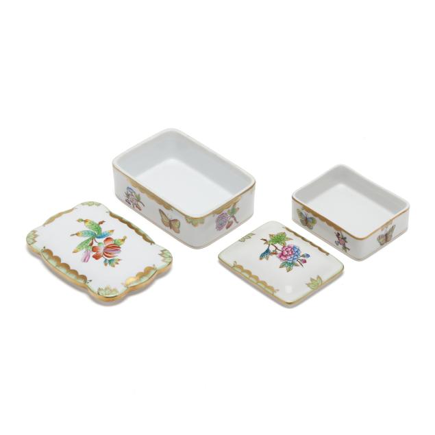 Queen Victoria (Green Border) pieces: a #415 footed oval tray (10 1/4 x 7 3/4 x 3 in.), a #1211 oval dish (10 1/4 x 8 1/4 x 1 1/4 in.), a #7975 lidded box with 150th anniversary mark (5 1/2 x 4 x 2 in.), and a #7973 small lidded box (4 1/4 x 3 3/8 x 1 3/4 in.); and (2)
