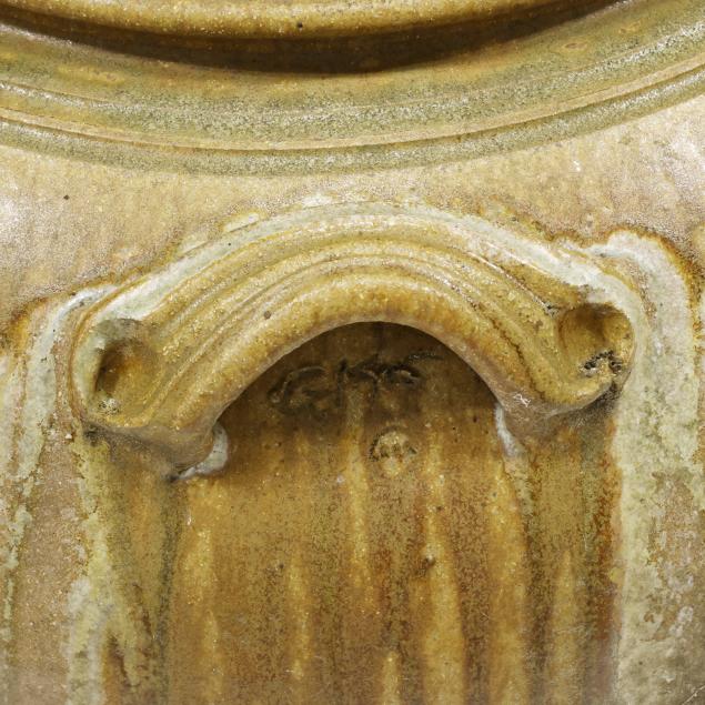 Vale, North Carolina, alkaline glazed stoneware, signed "GKE" and with round stamp beneath one of the four tooled lug handles, large ovoid form with waisted neck, featuring an attractive light brown branching ash glaze with glass glaze runs emanating from the handles.