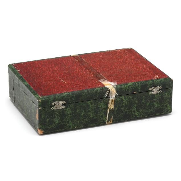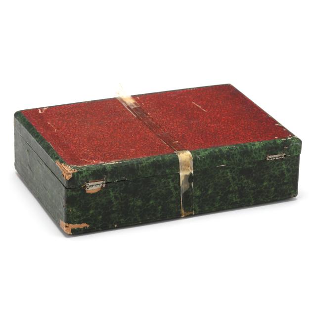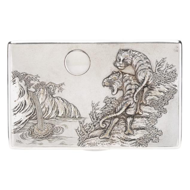 Circa 1900, mark of "W & Co. / Plate" to the underside, retailed by Wing On Wo & Co., New York, the lid featuring a landscape with tigers and a waterfall, opening to reveal a lined interior, not monogrammed, presented in its original retail box.