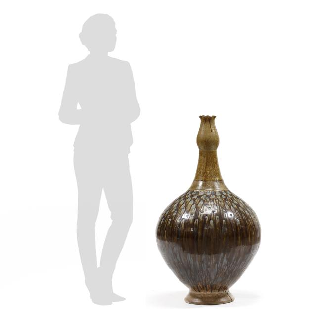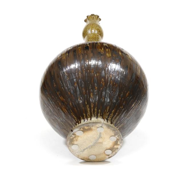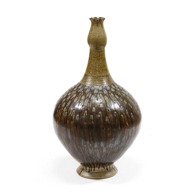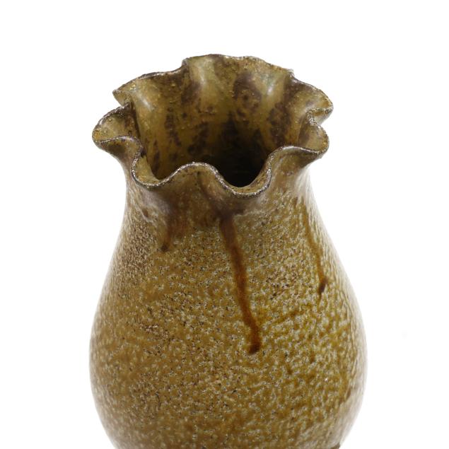 Pittsboro, salt glazed stoneware, stamped with 1995-present oval potter's glyph and 80th firing mark, featuring a rising neck with budding capital emerging from a round footed ovoid body, the shoulder impressed rectangular glass decoration mingling with runny ash glazes.