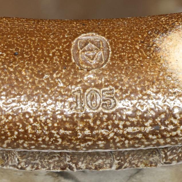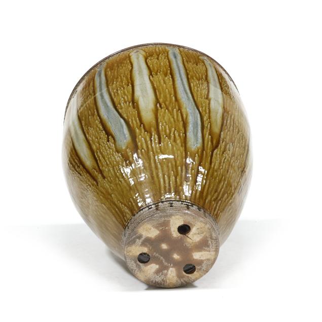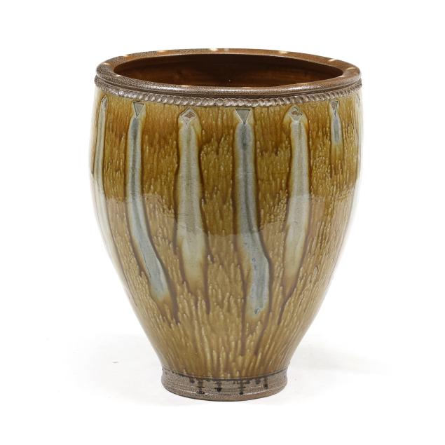 Pittsboro, salt glazed stoneware, stamped with 1995-present oval potter's glyph and 105th firing mark, jardiniere form with crimped relief band under the flat rim, decorated in ash glazes and glass runs descending from impressed geometric glass mounts, the base with three integral holes for drainage.