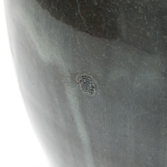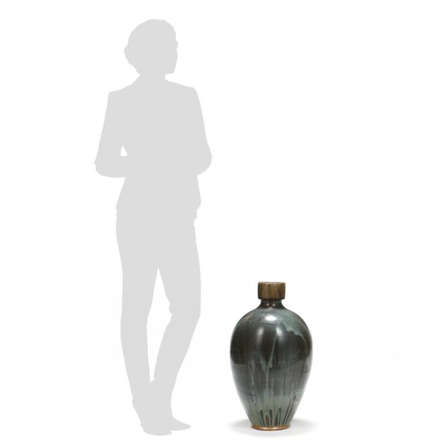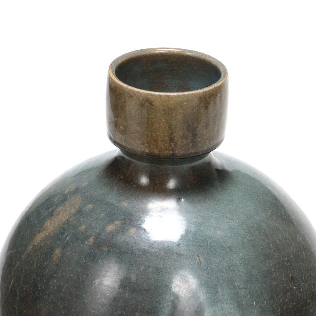 Pittsboro, salt glazed stoneware, stamped with 1995-present oval potter's glyph and 80th firing mark, of semi-ovoid form with cylindrical cup form capital and round foot, featuring an atmospheric proprietary smalty blue-gray glaze.