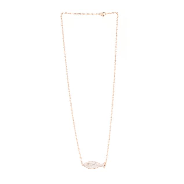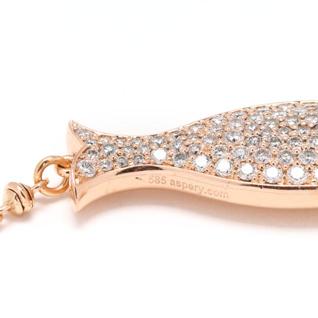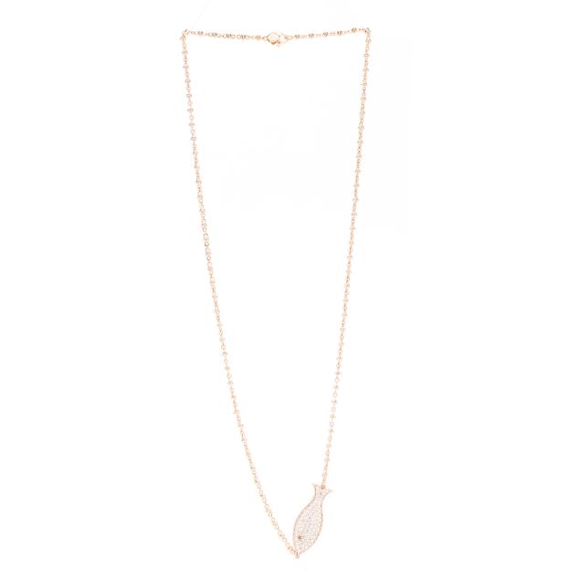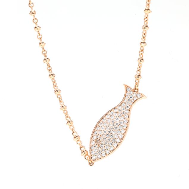 Horizontally set fish pendant, pavé set with full cut round diamonds, with Light Brown diamond eye to each side, joined to a mixed link chain completed with a spring ring clasp and set with two full cut round diamonds, marked 585 and with maker's name. Total diamond weight is approximately 1.50 carats (H-I color, SI1-SI2 clarity).