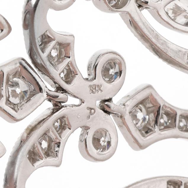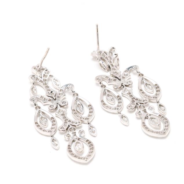 The white gold girandole earrings with shaped scrolls and marquise cut diamond drops, set allover with full cut round diamonds, completed with posts, stamped 18K. Total diamond weight is approximately 3.60 carats (G-H color, VS2-SI1 clarity).