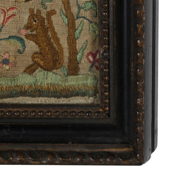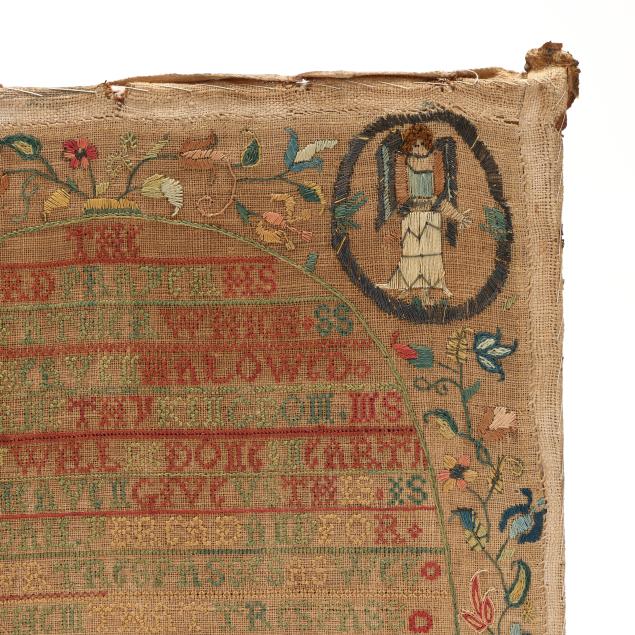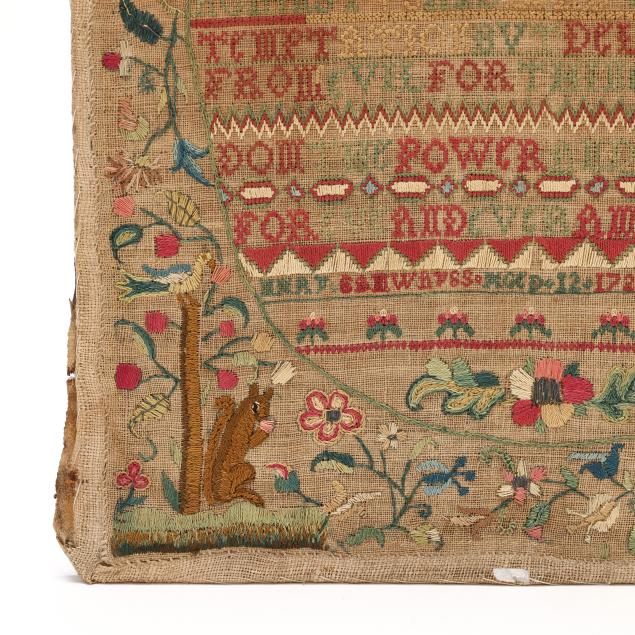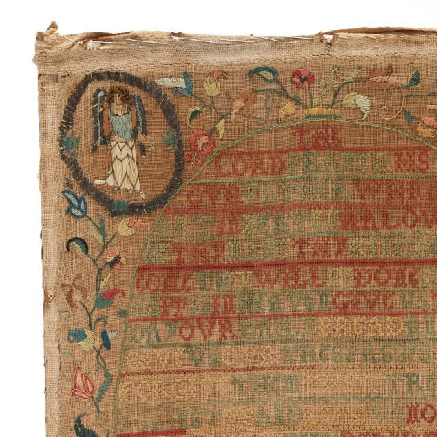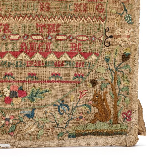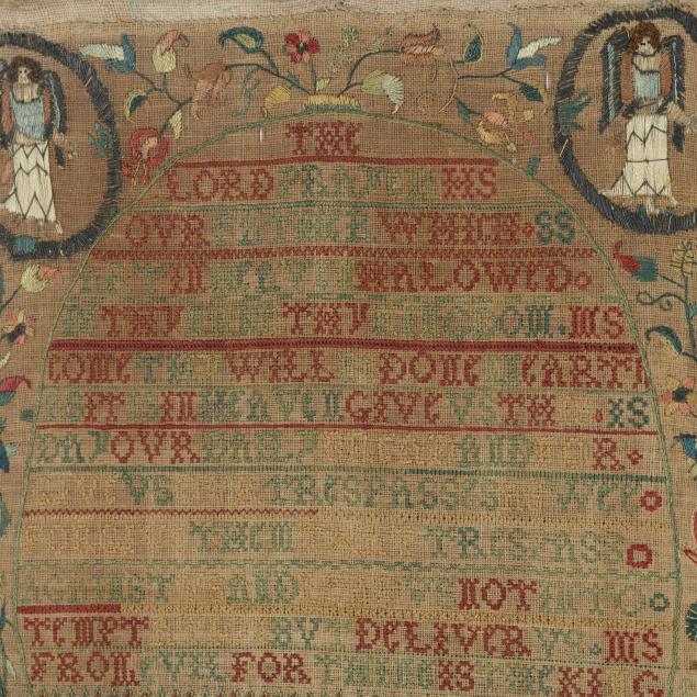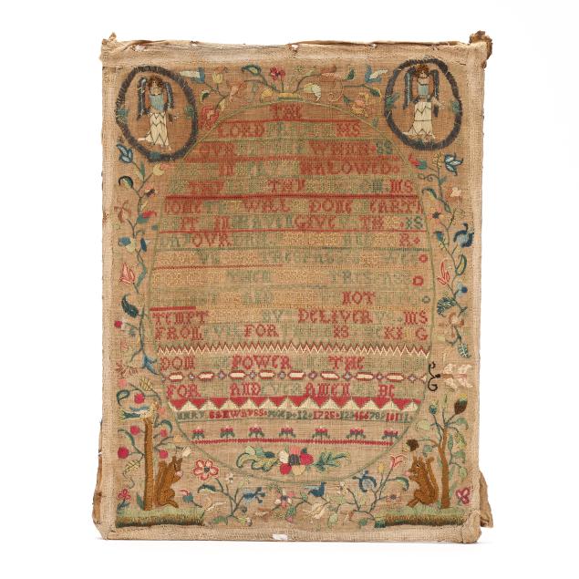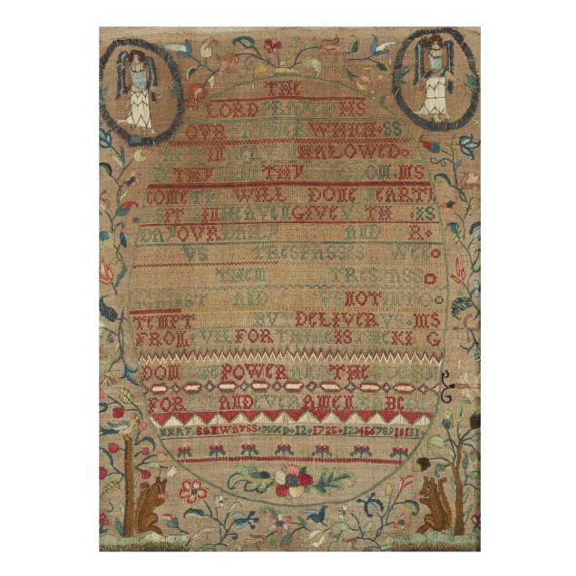 1725, English or American, silk, wool, linen, and metallic thread, featuring the Lord's Prayer in green and red cross-stitch in central oval, with decorative bands, including signature "Mary Samwayss Aged 12 1725," the upper corners with satin-stitched angels encircled in metallic thread, the lower corners with squirrels eating berries, the border of freeform multicolored floral and foliate motifs in chain-stitch and satin-stitch with decorative bands featuring the queen stitch—a mark of excellent accomplishment; sampler is hand-sewn to cotton covered board and presented under glass in carved wood frame with label from Ginsburg & Levy Antiques, New York, included on backing.