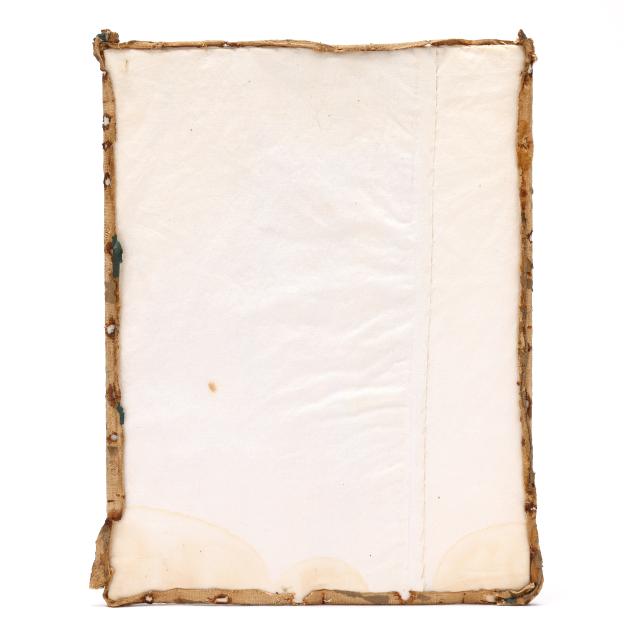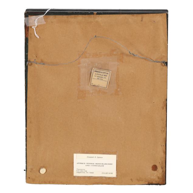 Mostly bright unfaded colors; some discoloration to ground; tarnishing of metallic thread; some loss to frame; frame with paper fillets and looseness to glass; with old strips of linen hand-sewn to edges and with old tack holes from original mounting, now discolored and with some brittleness and residue; paper backing on frame has been removed; back of cotton mounting board with evidence of moisture damage.