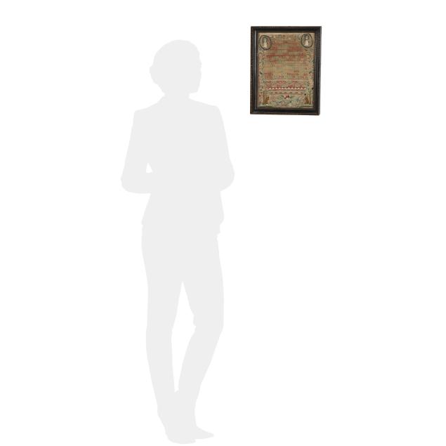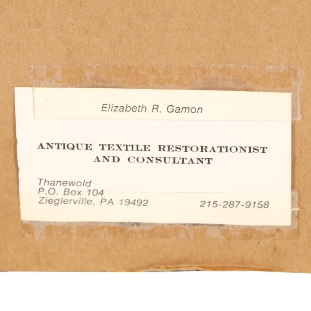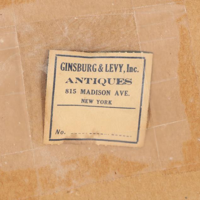 This sampler was likely once sold by Ginsberg & Levy Antiques, founded in 1901. With a focus on fine early American antiques, items from Ginsberg & Levy Antiques can be found in numerous public and private collections including The Metropolitan Museum of Art, Bayou Bend, Winterthur, The Art Institute of Chicago, The Museum of Fine Arts Boston, Historic Deerfield, The Diplomatic Reception Rooms at the United States Department of State, and The White House.
