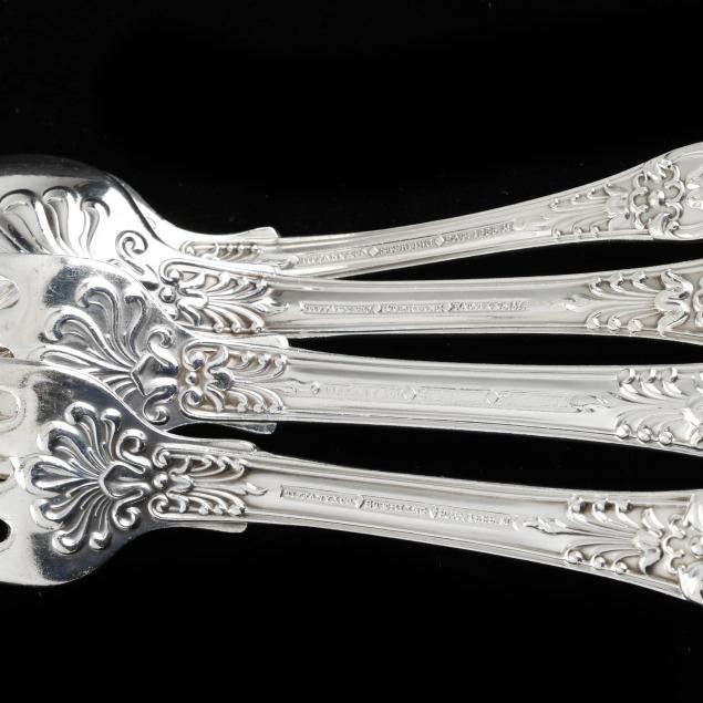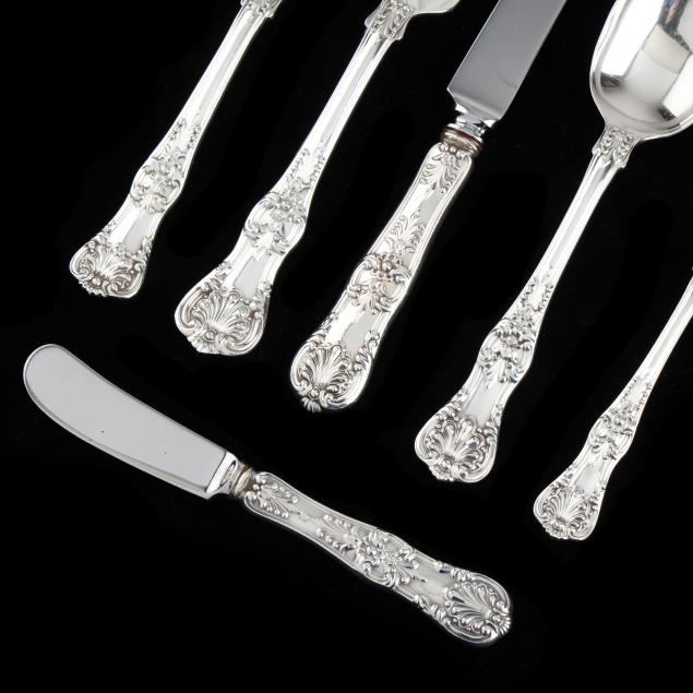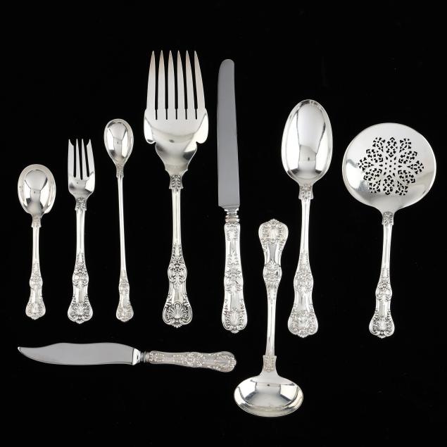 20th century, (103) pieces to include: (3) dinner knives (10 1/4 in.); (14) luncheon knives (9 1/8 in.); (7) dinner forks (7 1/2 in.); (12) luncheon forks (6 3/4 in.); (13) salad forks (6 3/4 in.); (13) teaspoons (5 7/8 in.); (4) fish forks; (4) fish knives; (7) oval bowl soup spoons; (9) iced tea spoons; (9) butter spreaders; (4) tablespoons; a large serving fork; a gravy ladle; a sugar spoon; and a tomato server. Not monogrammed, presented in a fitted flatware case.