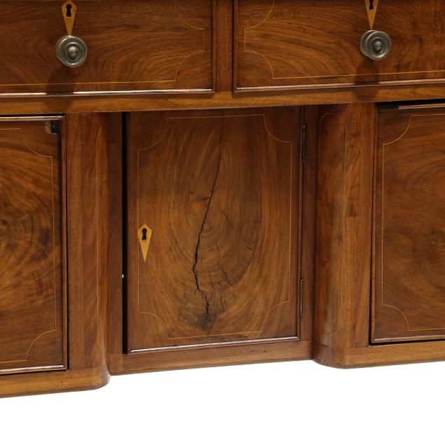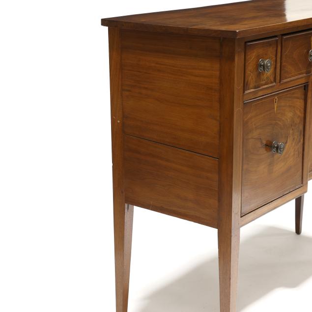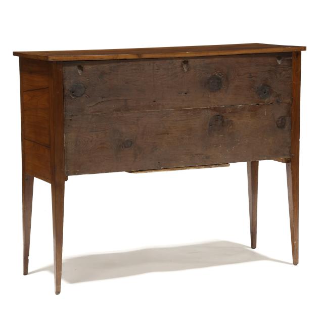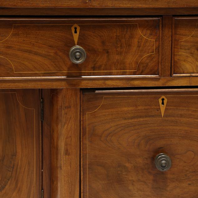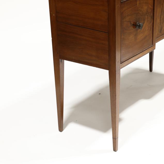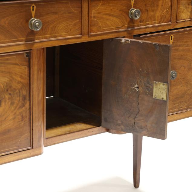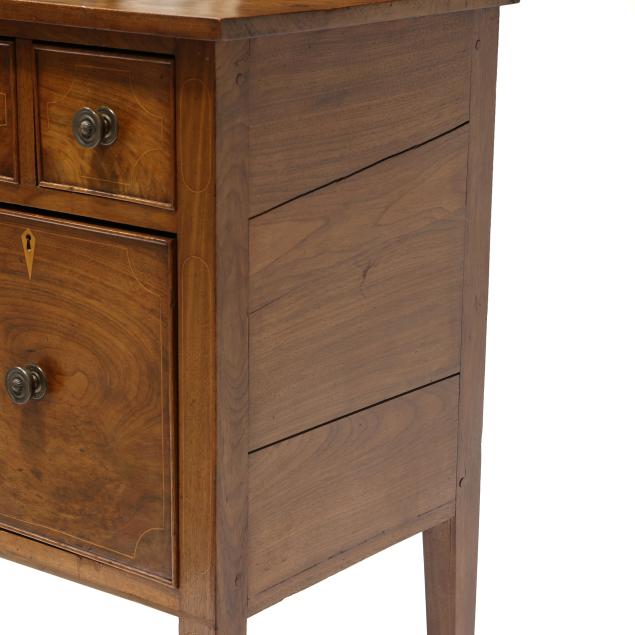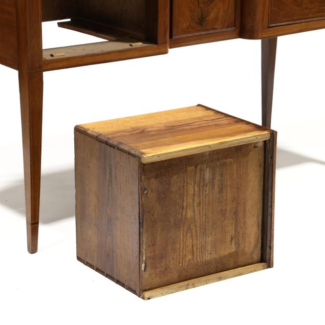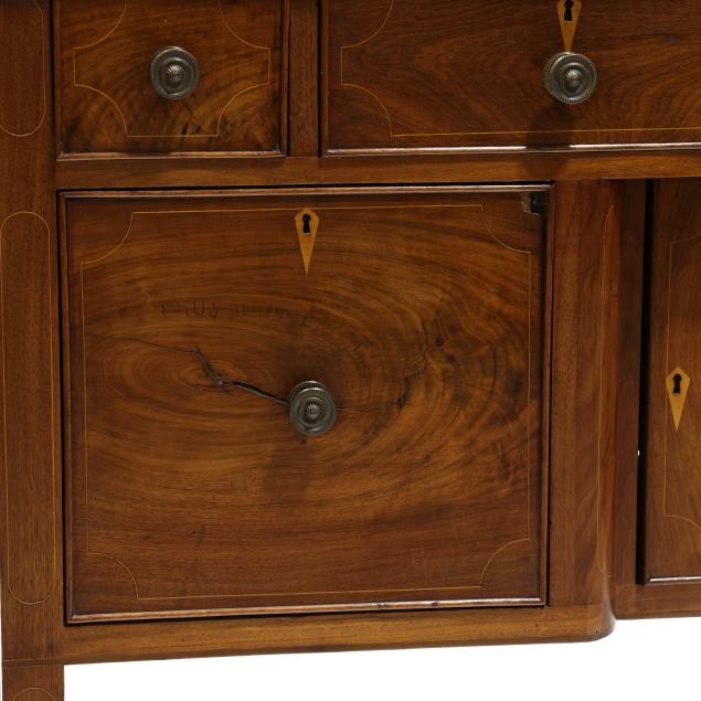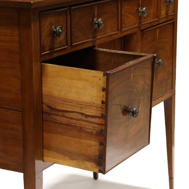 Restoration and repairs including top reset and likely later; all drawers reset now with wire head nails; drawer runners rebuilt; later drawer guides and medial braces; large shrinkage crack to cabinet door; later pulls; cock beading loss to right deep drawer; some cuff inlay loss.
