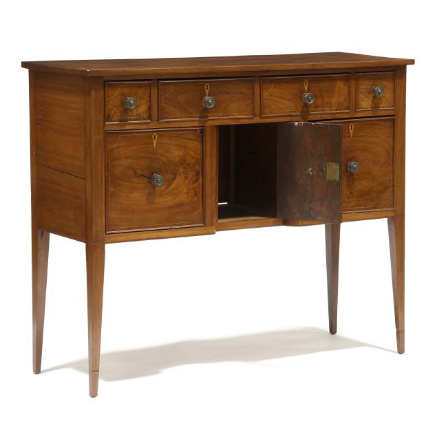 Southern, with restoration, yellow pine secondary, the rectangular form featuring four small side by side cock beaded drawers above a central cabinet door flanked by two deep drawers, raised on tall square tapered legs.
