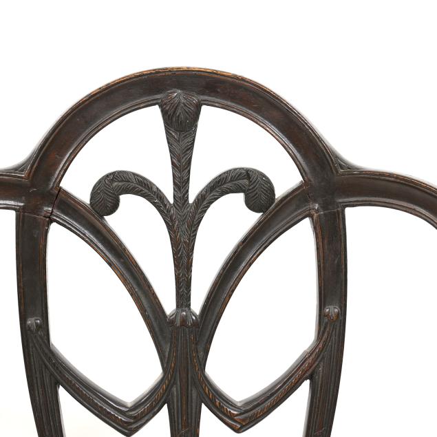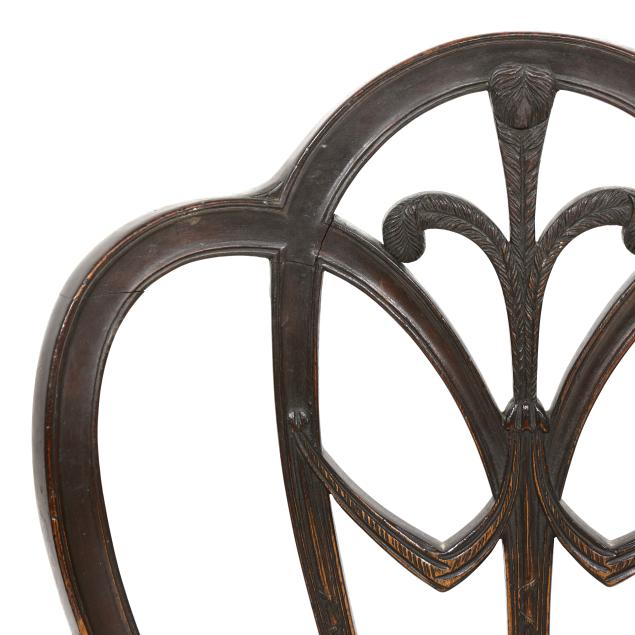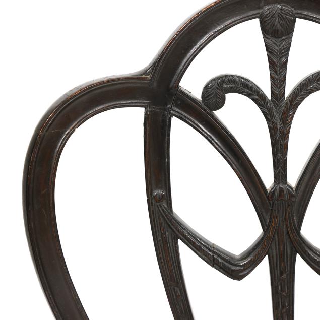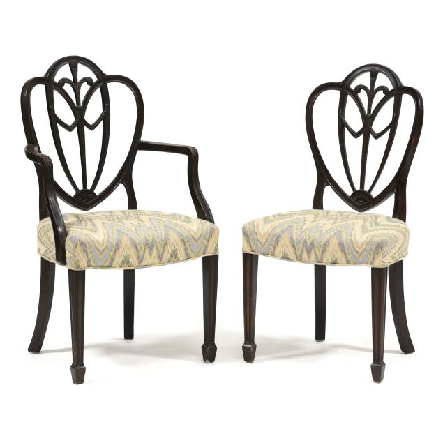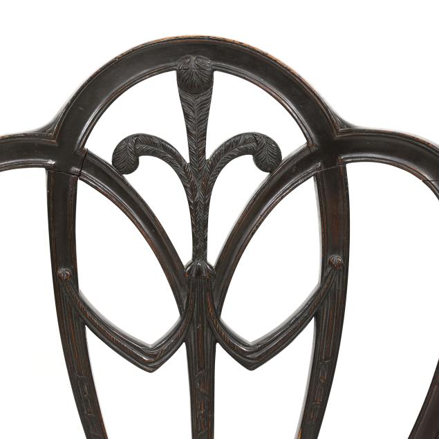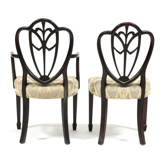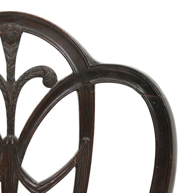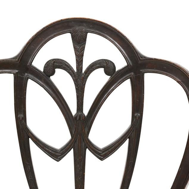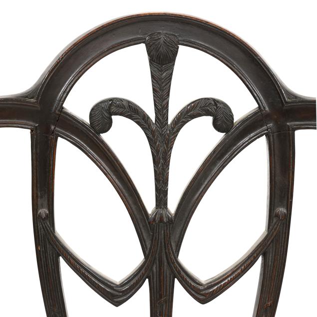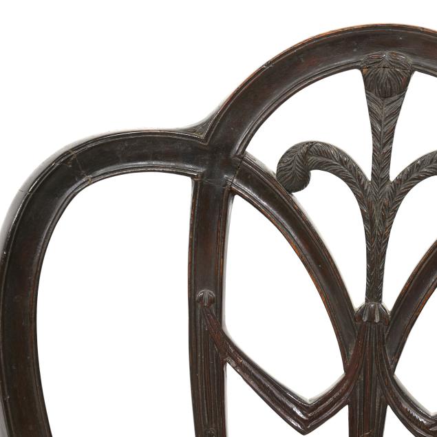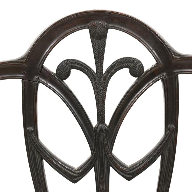 Late 19th century, including two arm chairs and ten side chairs, classic shield back form featuring a concave relief carved and pierced seat back, central relief carved Prince of Wales plume, molded stiles, over upholstered seats, molded tapered front legs with spade foot, down-swept rear legs.
