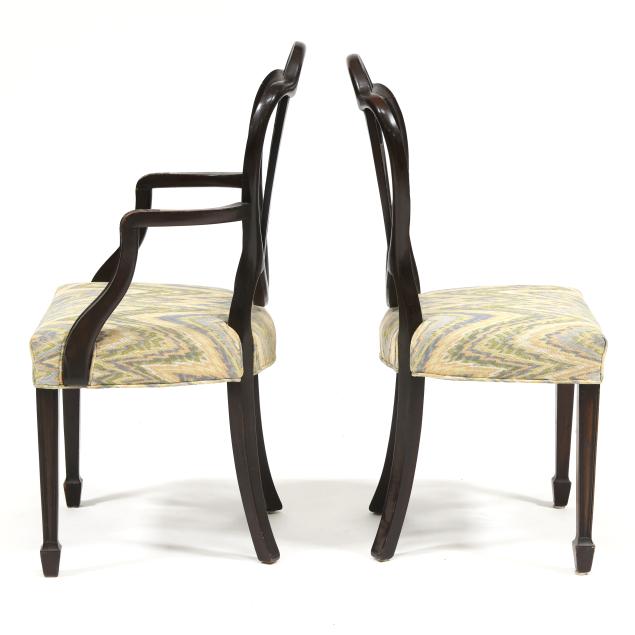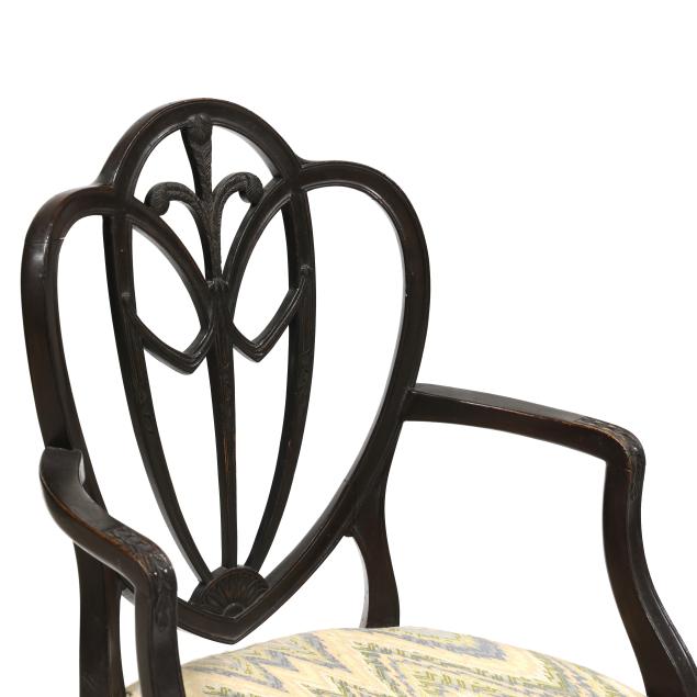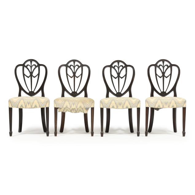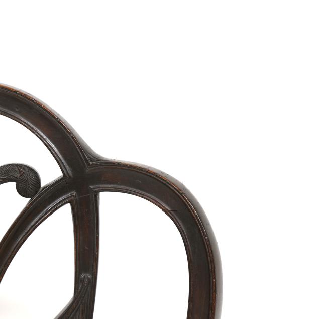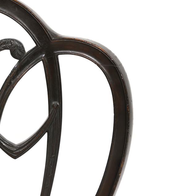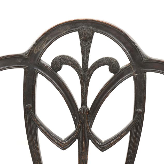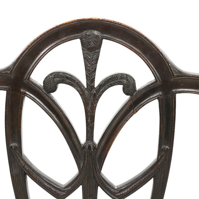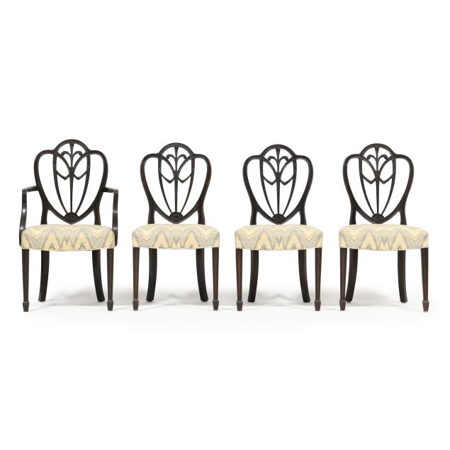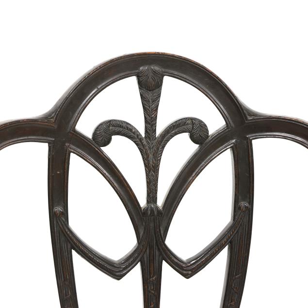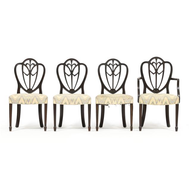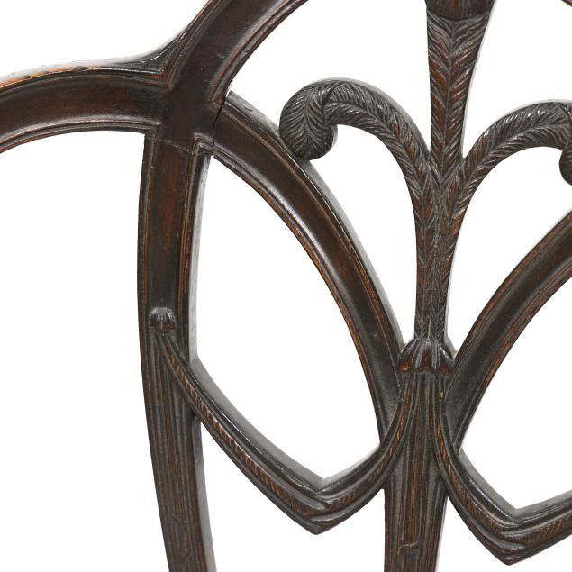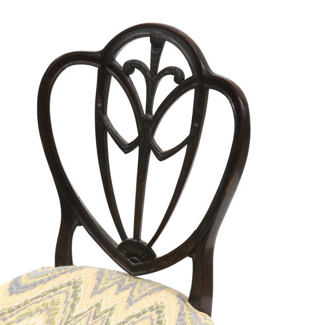Late 19th century, including two arm chairs and ten side chairs, classic shield back form featuring a concave relief carved and pierced seat back, central relief carved Prince of Wales plume, molded stiles, over upholstered seats, molded tapered front legs with spade foot, down-swept rear legs.