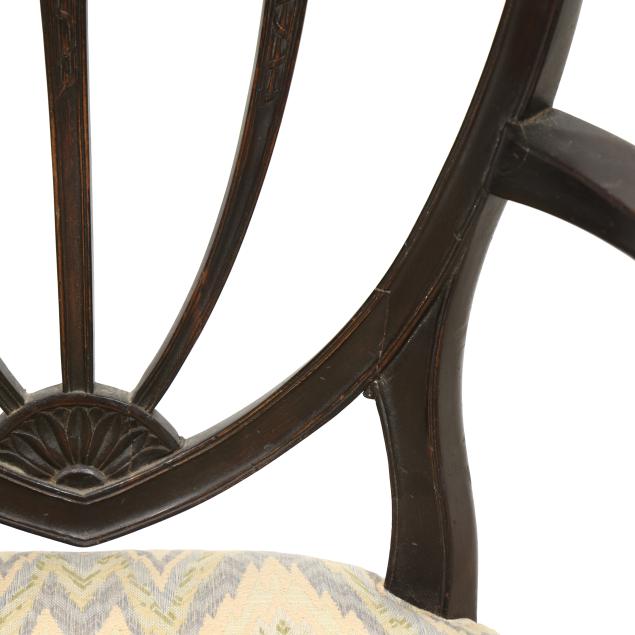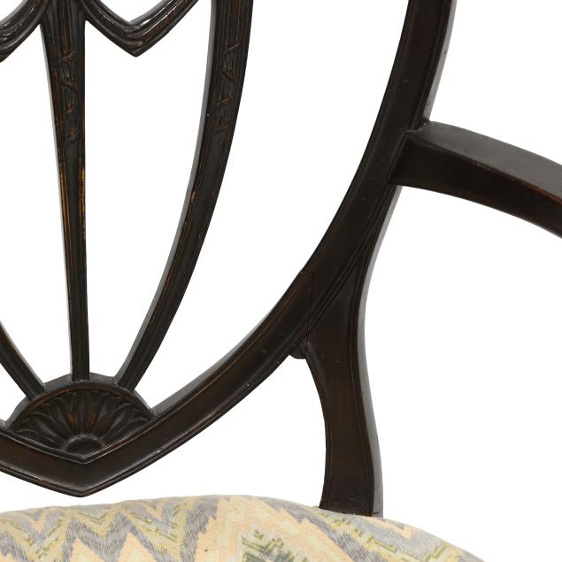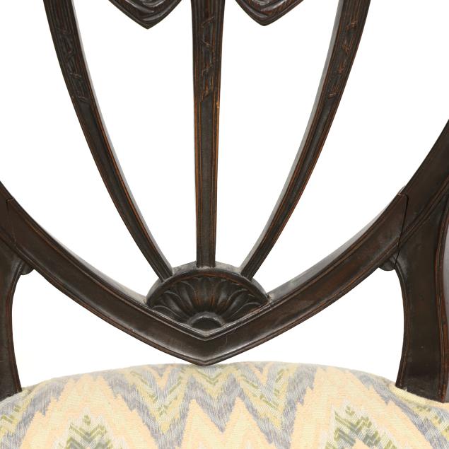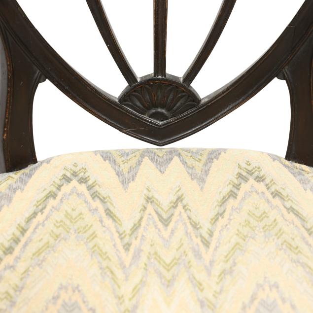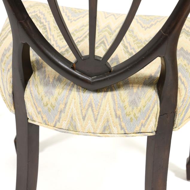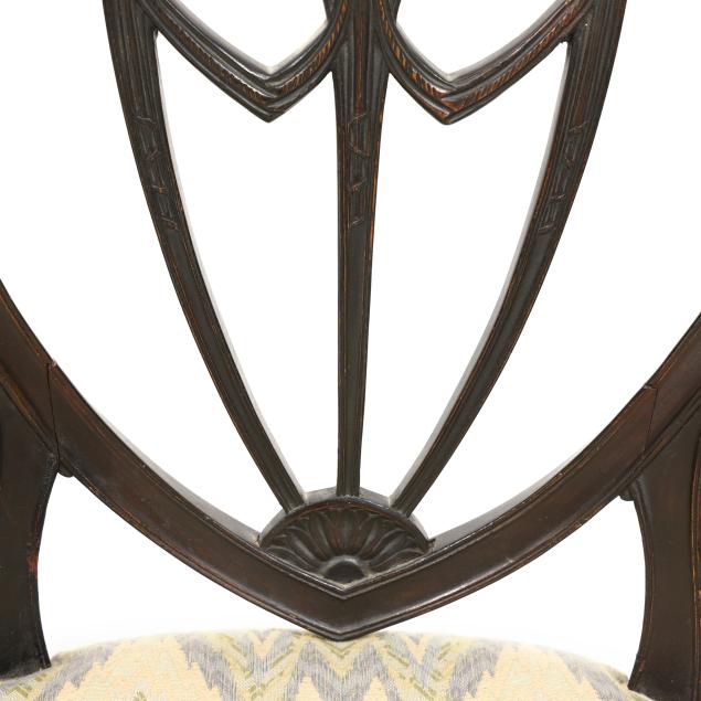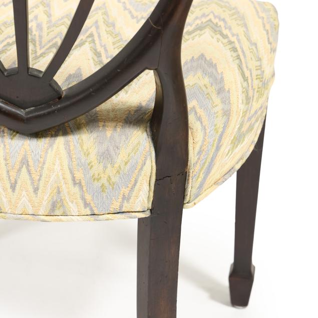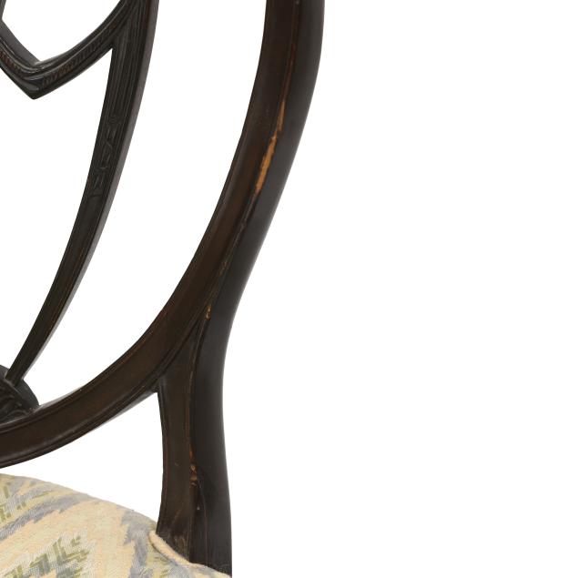Later upholstery with staining and wear; several chairs with tight hairline cracks to the shield back.
