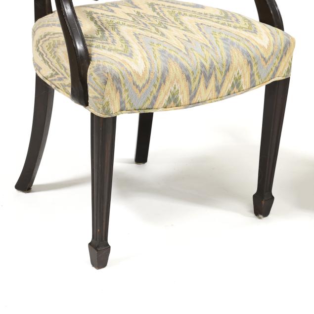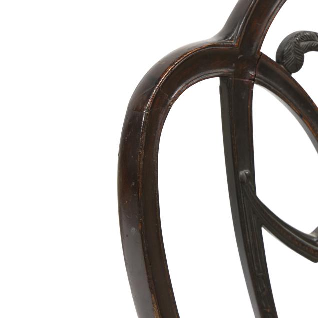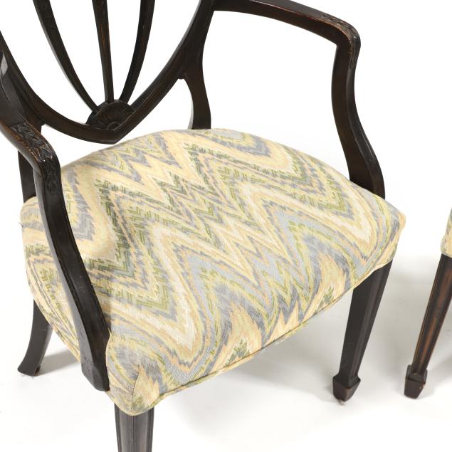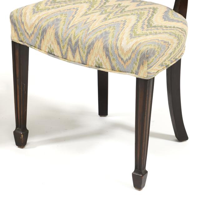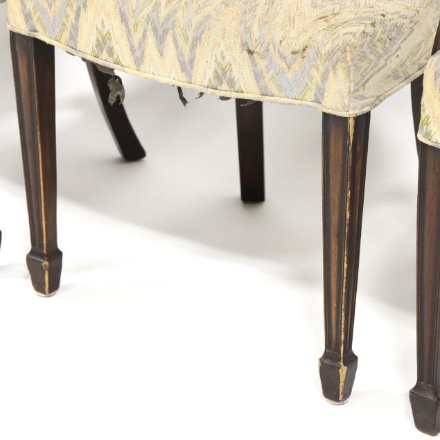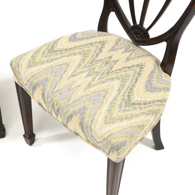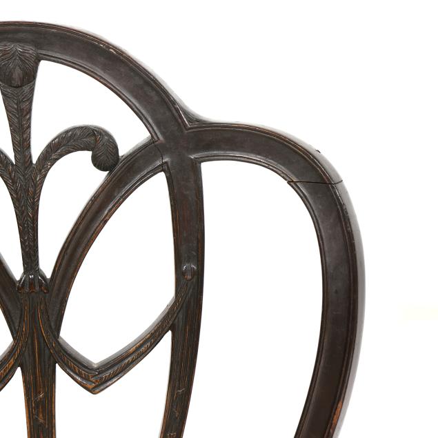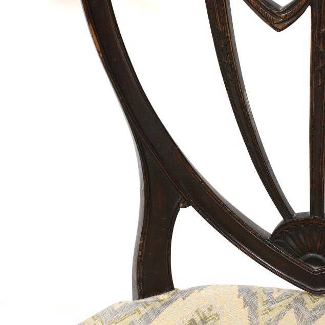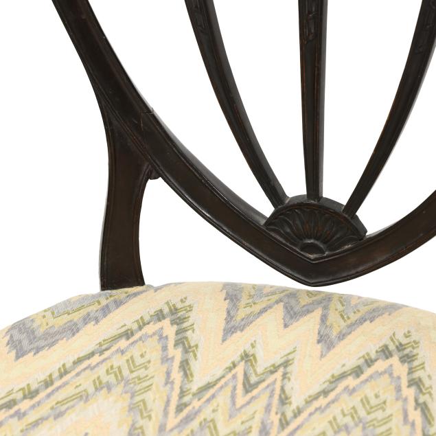 Later upholstery with staining and wear; several chairs with tight hairline cracks to the shield back.