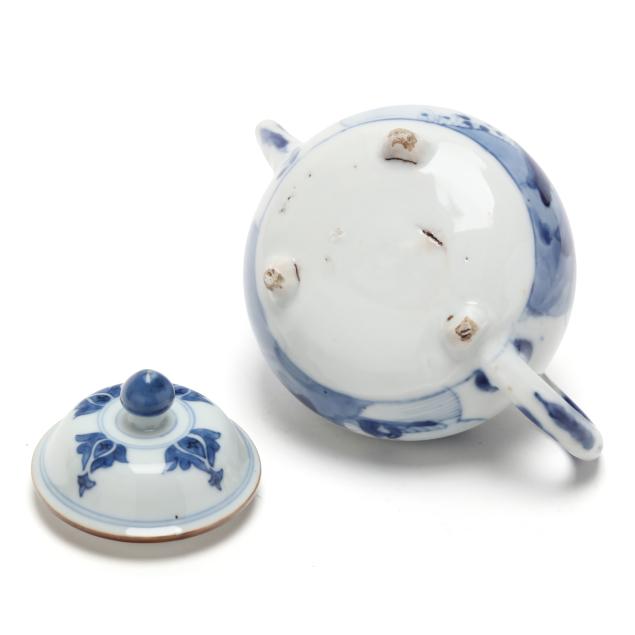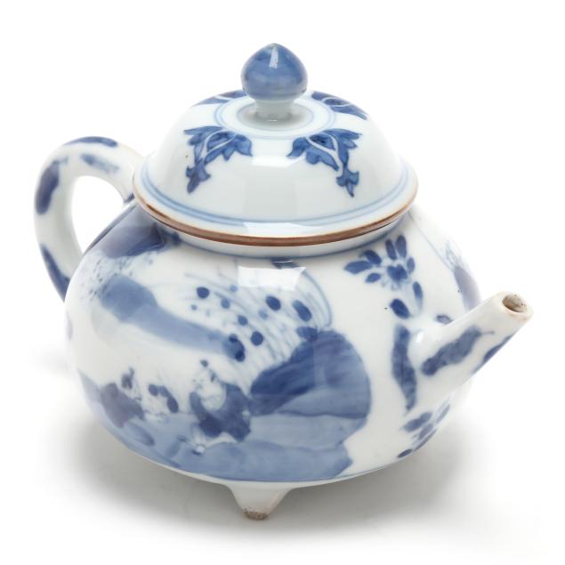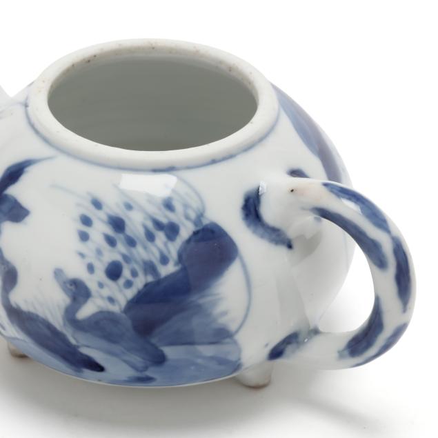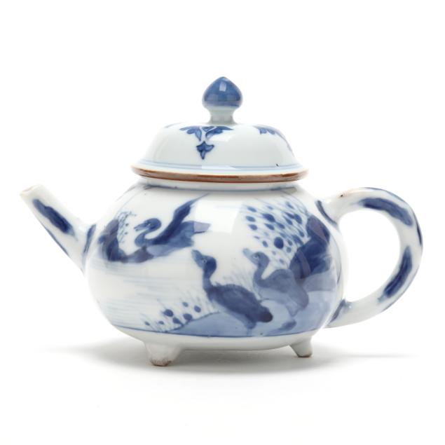 Kangxi period (1662-1722), porcelain hand-painted in underglaze blue, the diminutive globular teapot is decorated with geese and water plants, the cover with stylized flowers, raised on three squat feet.