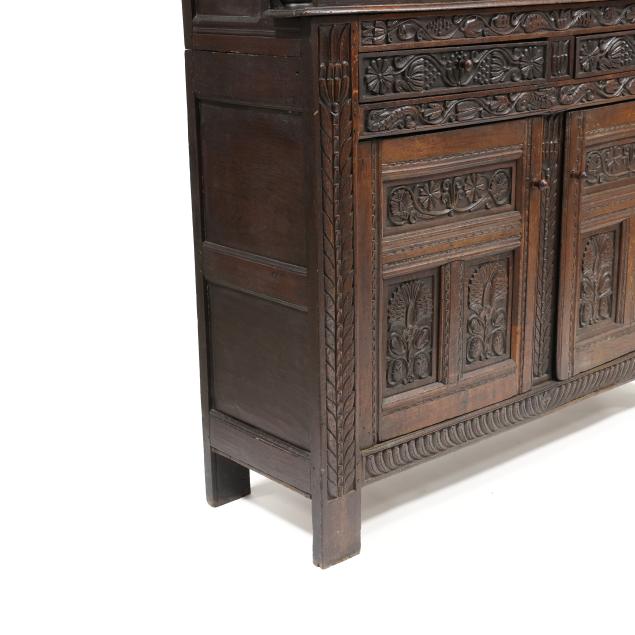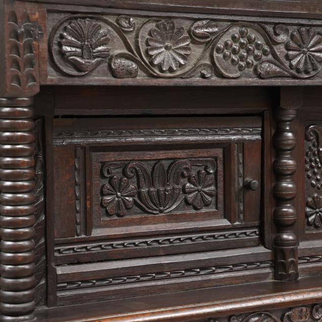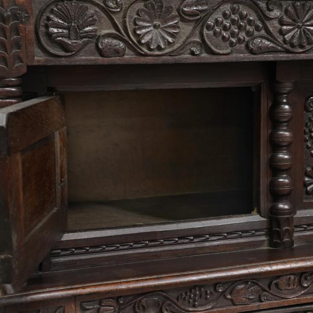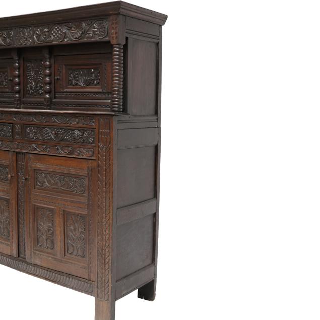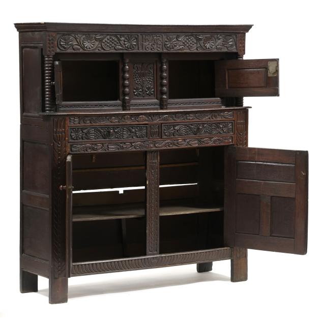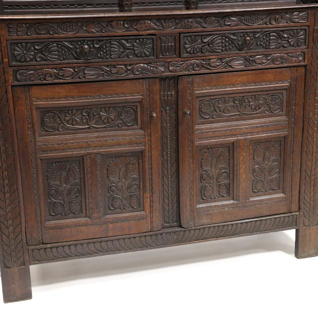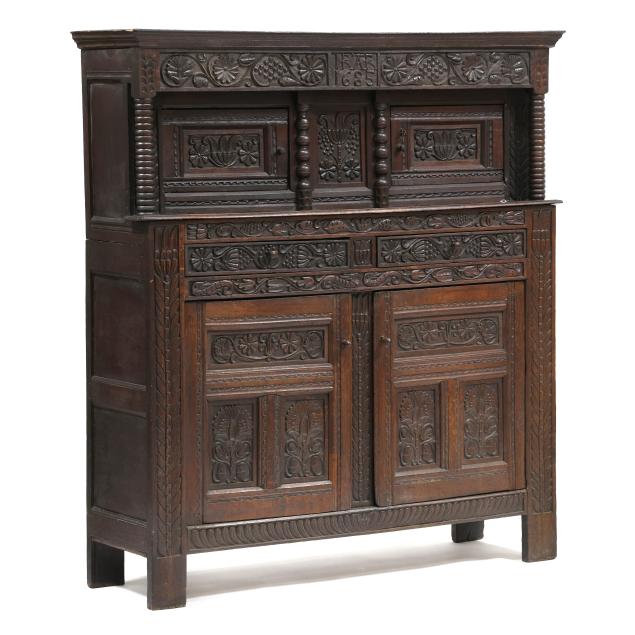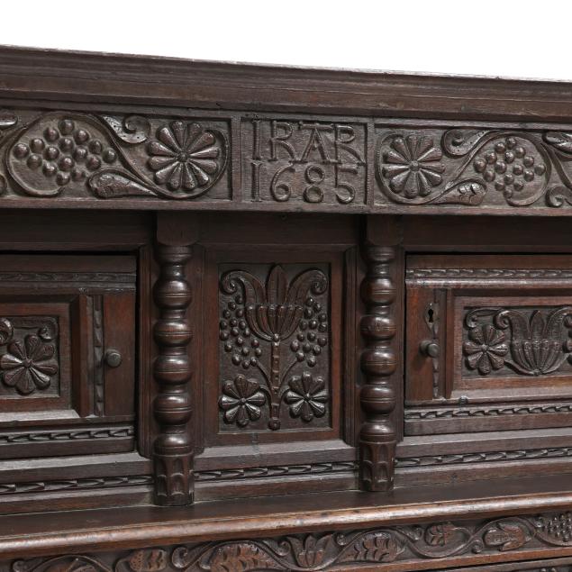 Late 17th century, oak secondary, one part form with wood peg and hand wrought nail construction, applied molded cornice, relief carved frieze with central panel reading "IRAR / 1685" flanked by stylized leaf and berry panels, over a recessed cabinet with two hinged paneled doors and central relief carved panel with stylized flower and berry motifs, divided interior with 1/4 upper shelf, half turned central stiles and stacked disc column supports, the lower case with repeating relief carved frieze, two relief carved drawers and stiles over two hinged triple paneled doors with repeating stylized flower, vine and berry motifs, shelved interior, paneled sides, straight feet from the solid.