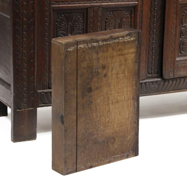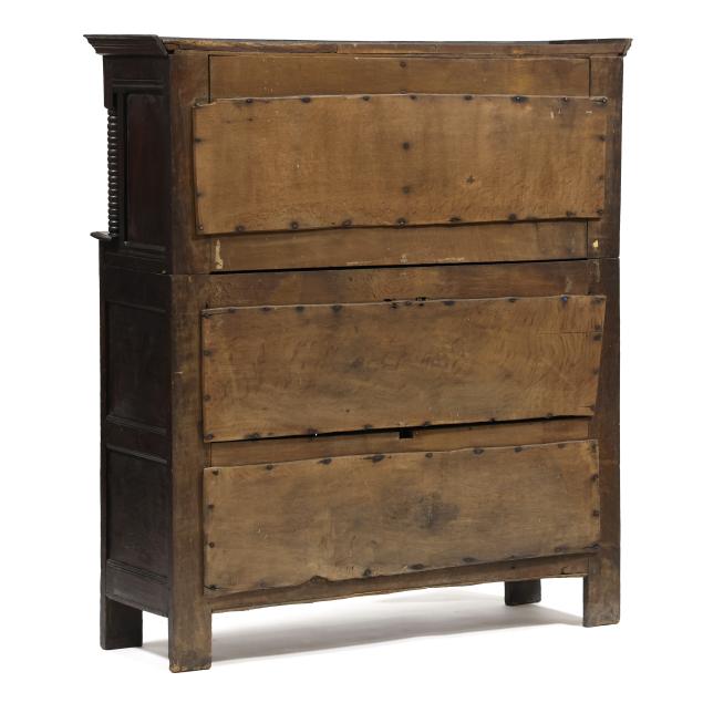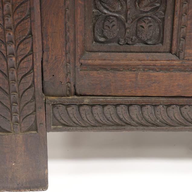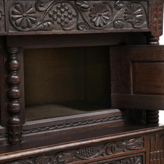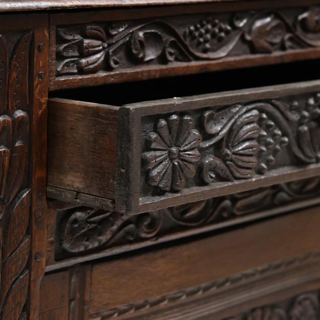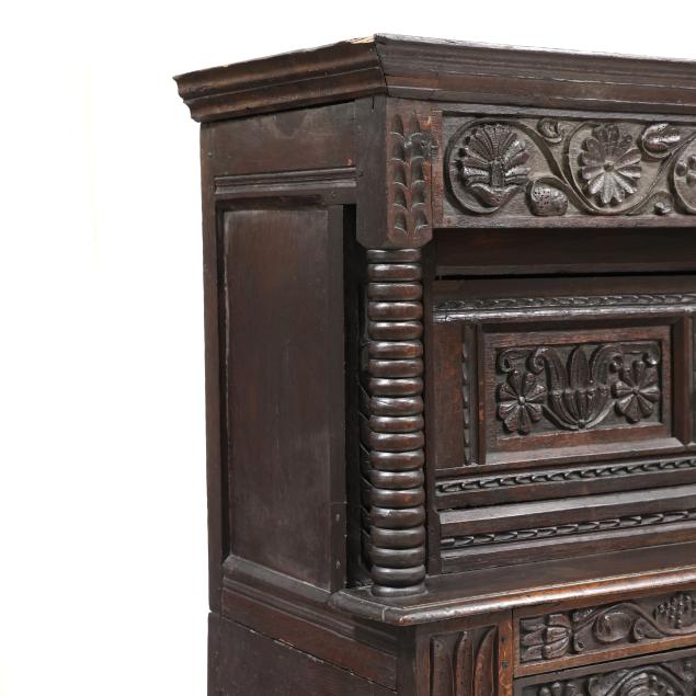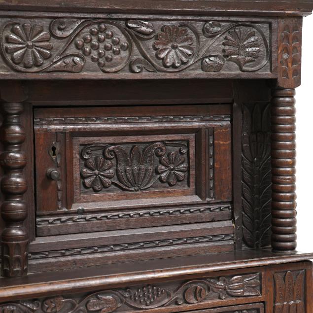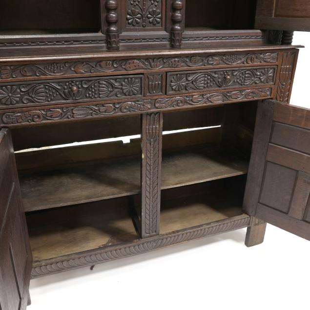 Late 17th century, oak secondary, one part form with wood peg and hand wrought nail construction, applied molded cornice, relief carved frieze with central panel reading "IRAR / 1685" flanked by stylized leaf and berry panels, over a recessed cabinet with two hinged paneled doors and central relief carved panel with stylized flower and berry motifs, divided interior with 1/4 upper shelf, half turned central stiles and stacked disc column supports, the lower case with repeating relief carved frieze, two relief carved drawers and stiles over two hinged triple paneled doors with repeating stylized flower, vine and berry motifs, shelved interior, paneled sides, straight feet from the solid.