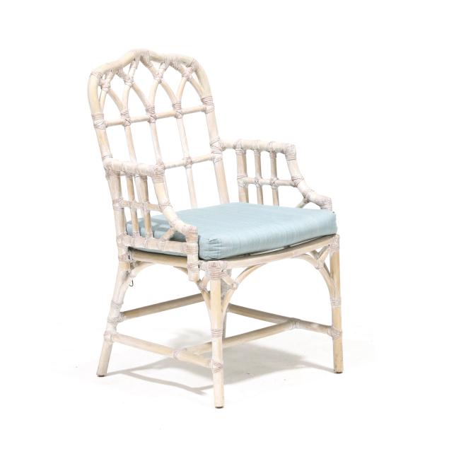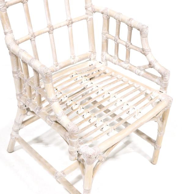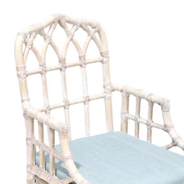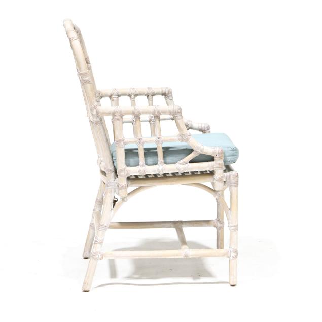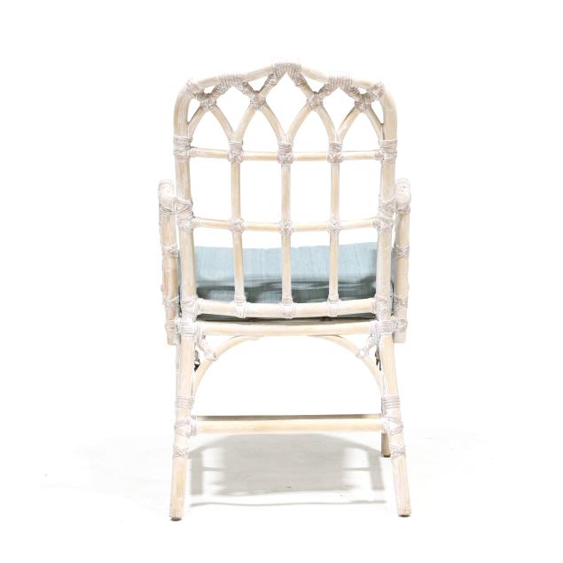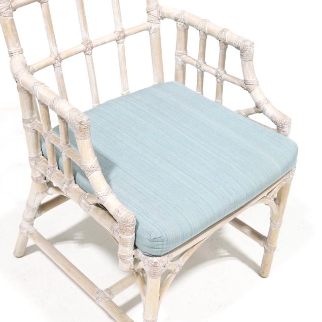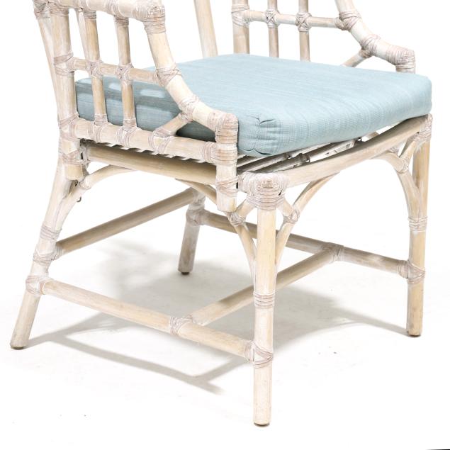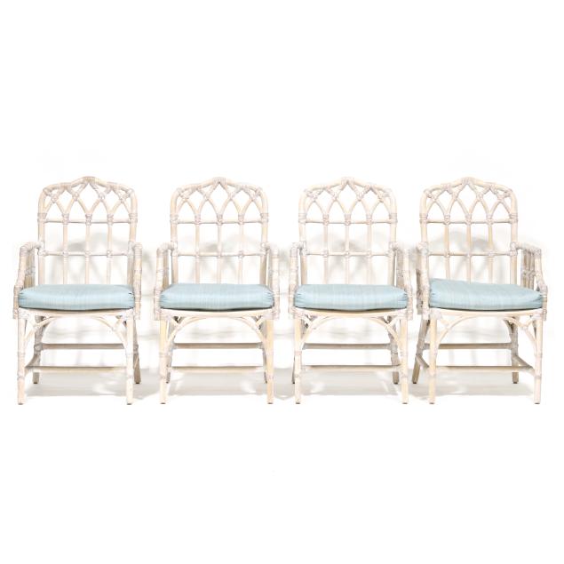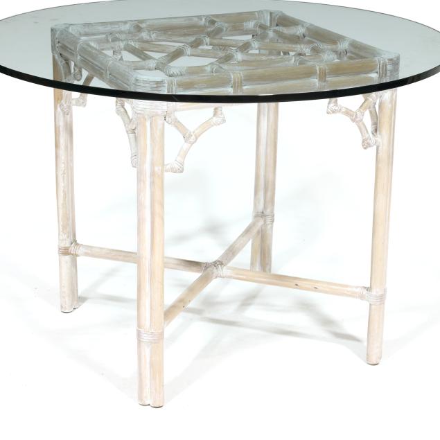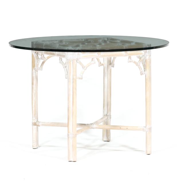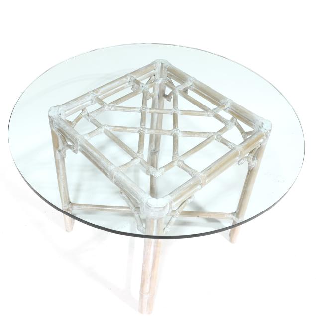 Manner of McGuire, including a circular glass top table (28.5 x 42 in. diameter), and four armchairs (39 x 21 x 21 in., arm height 27.25 in.), unmarked.